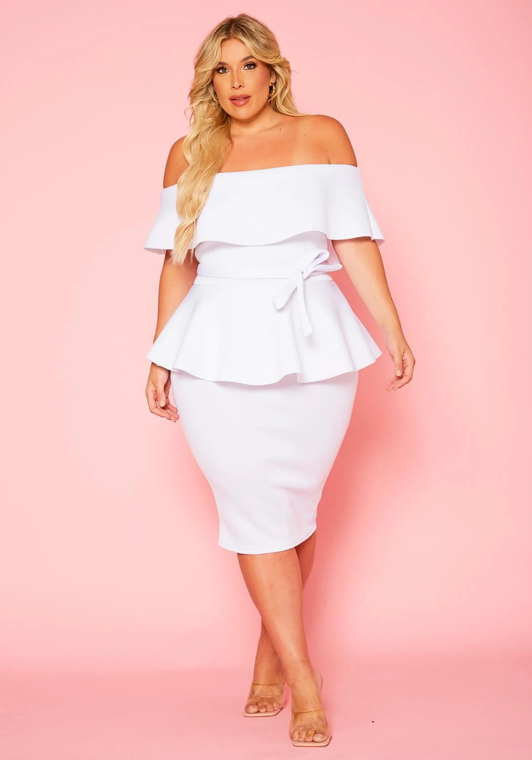 shop nowPlus Size Off-Shoulder Peplum Midi Dress – Elegant & Flattering Fit!