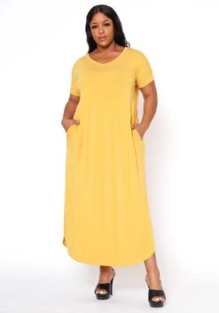 Simple yet lovely plus size women’s maxi dress in fit to flare design, v-neck style, sleeveless and with pocket ascent.