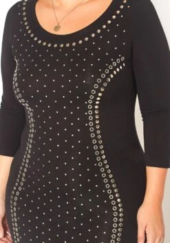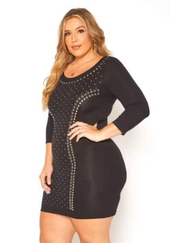 Plus size women’s special occasion bodycon mini dress with front embellished design, 3/4 fitted long sleeves and scoop neck style.