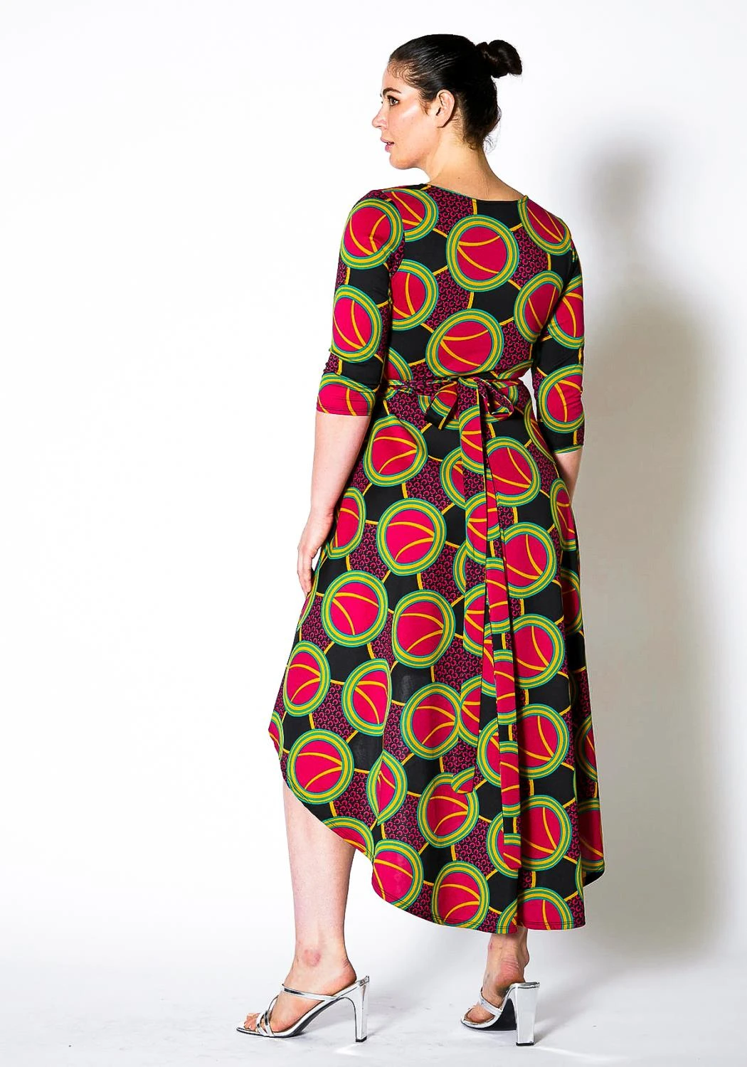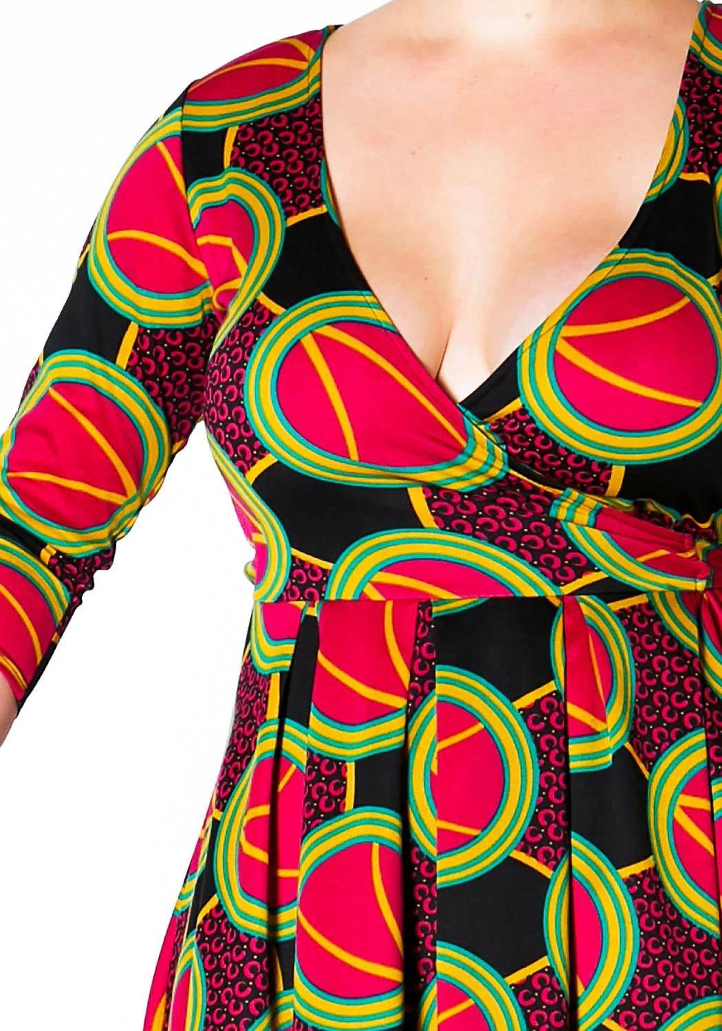 Plus size women’s multi color printed high low hem dress with pleated fold.