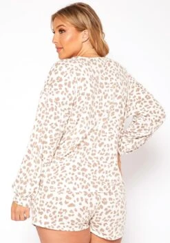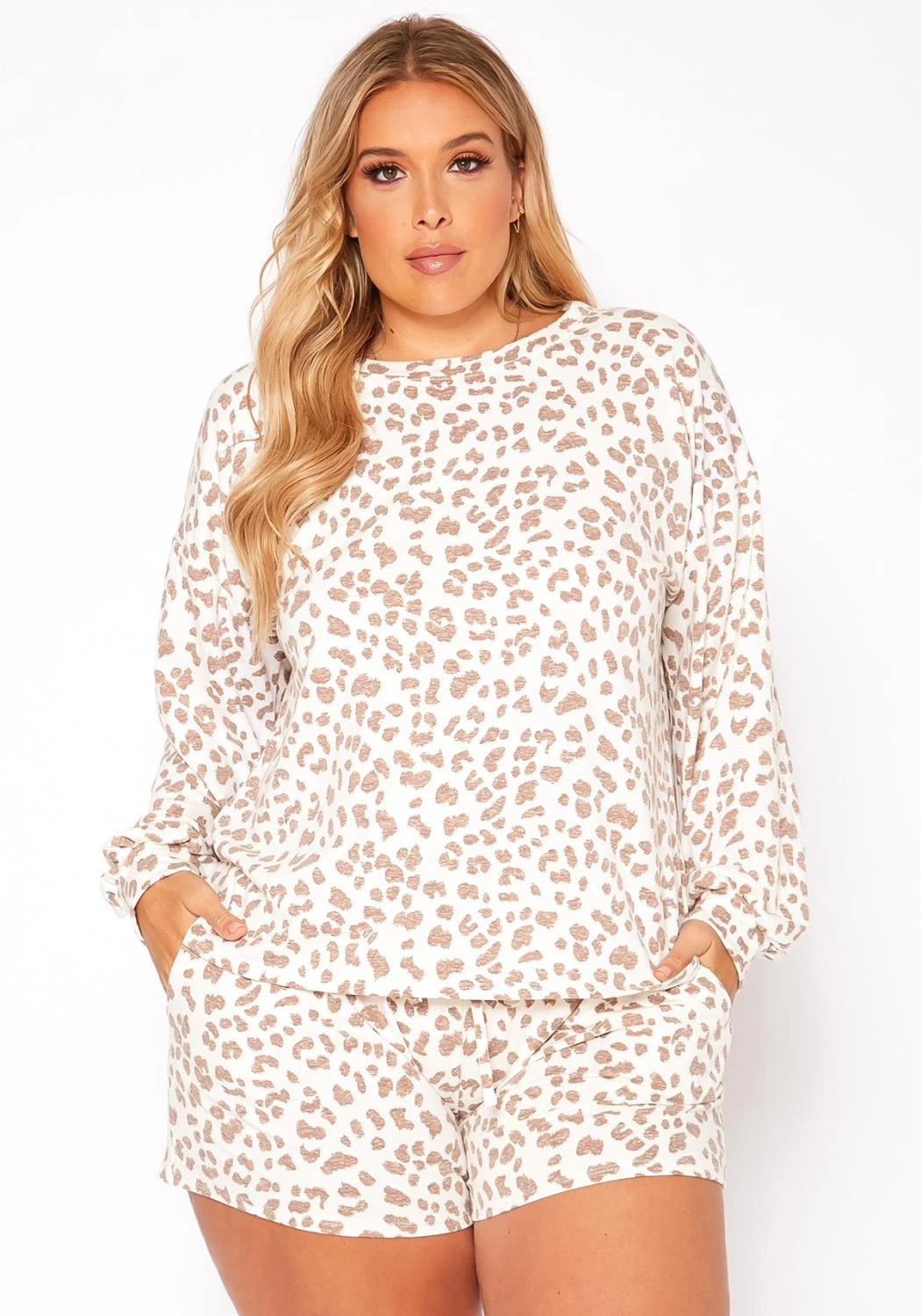 Stylish lounge set in leopard print for plus size women. Features a soft, relaxed fit sweater and waistline drawstring hem shorts with pockets.