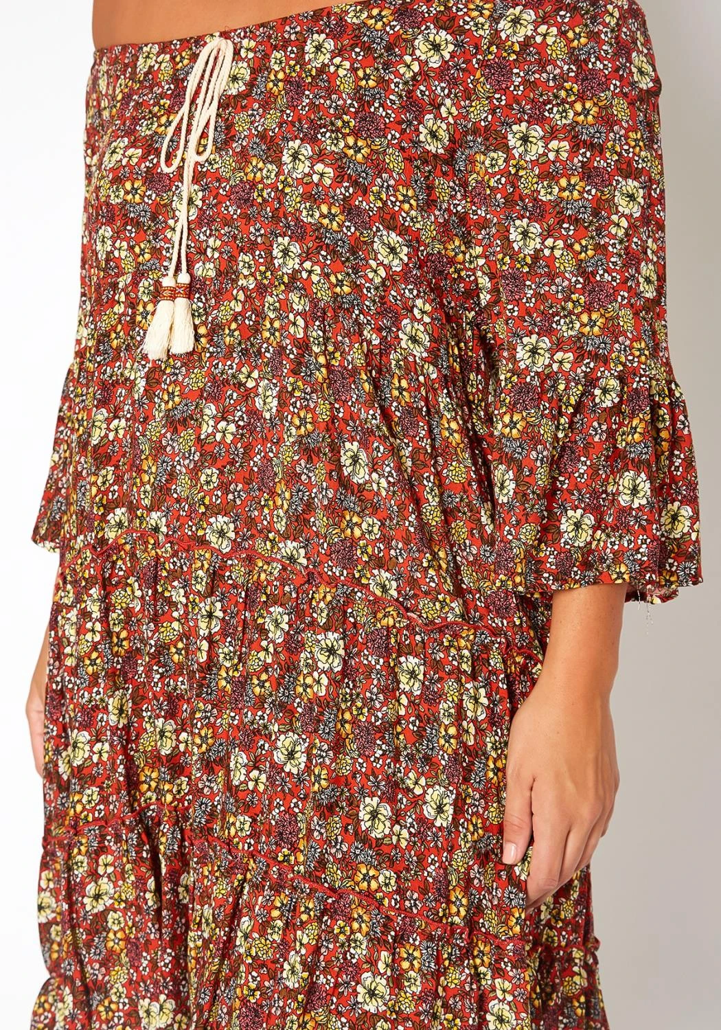 Bohemian plus size women’s mini dress in vintage floral pattern, off shoulder style, flare 3/4 long sleeves, rope tie front detail and fit to flare design.