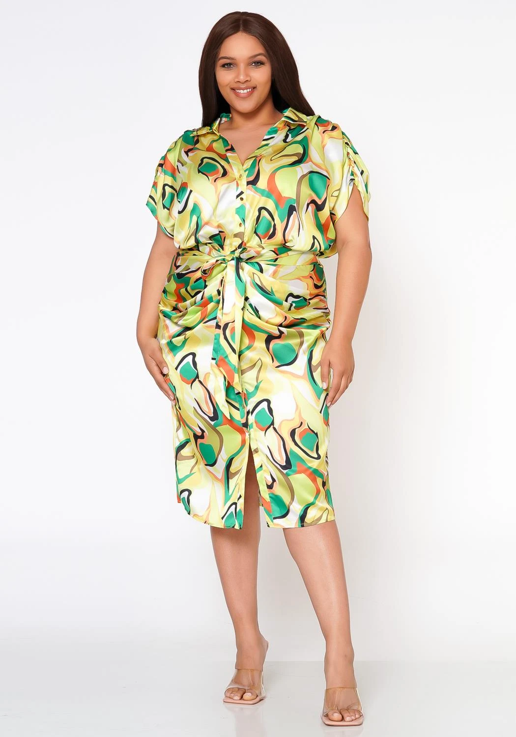 Lovely midi dress for plus size women in abstract pattern, button front closure, waist tie ascent, collar neck style and silk material.