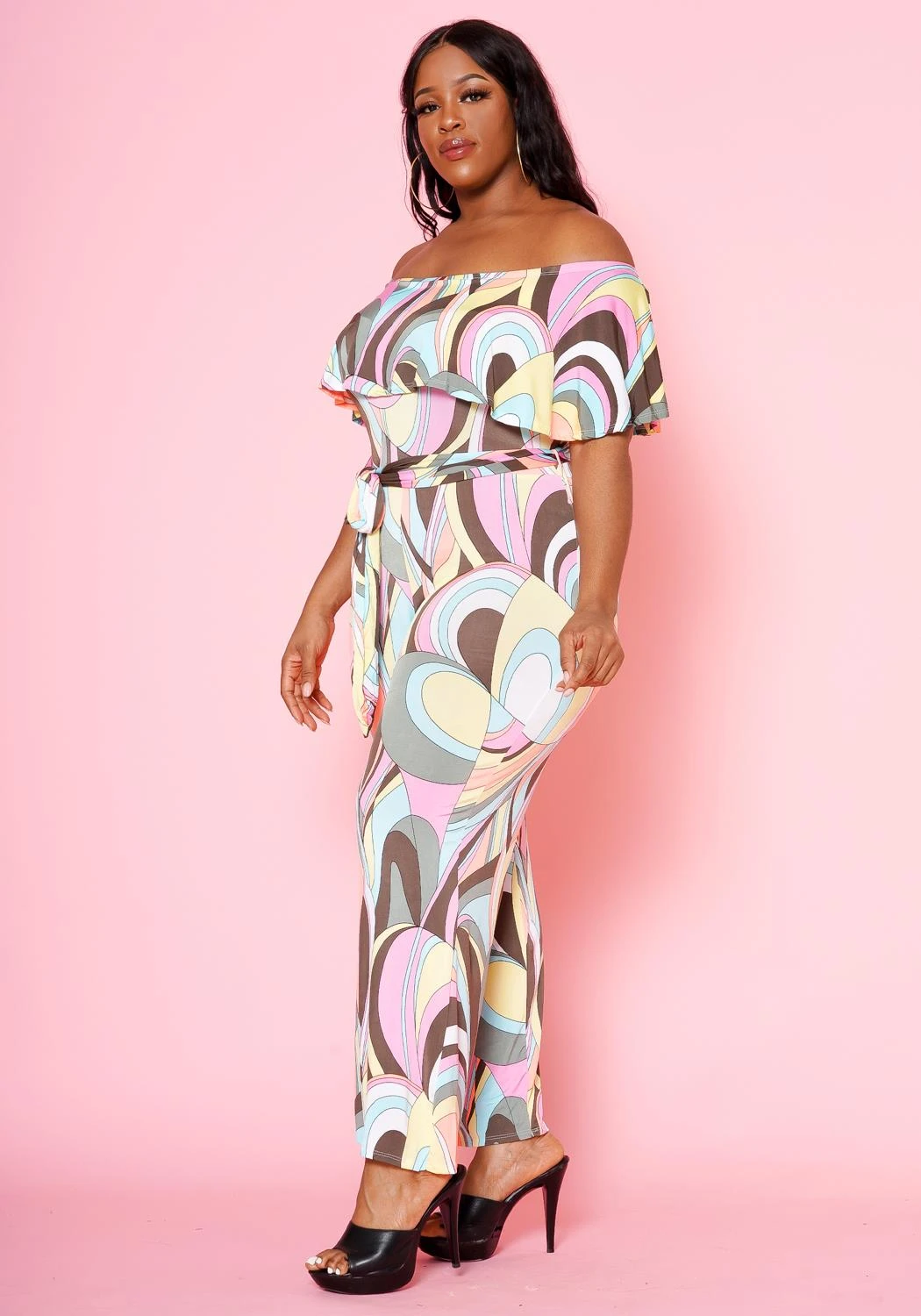 Unique plus size women’s jumpsuit that makes a stylish impression. Features pastel abstract pattern, off shoulder style with overlay hem and waist tie ascent.