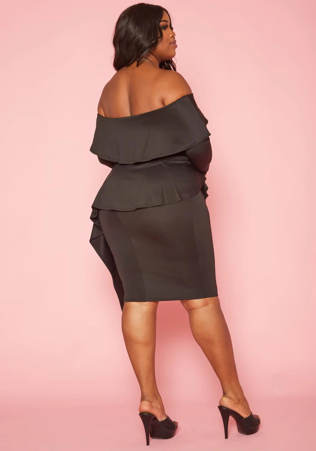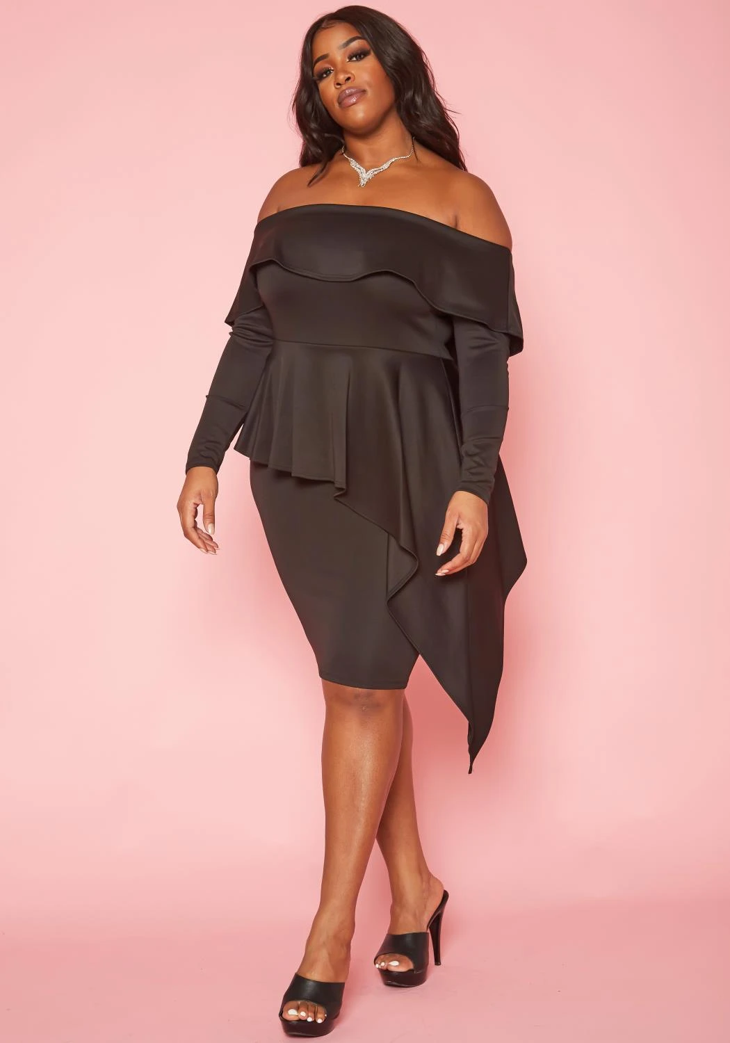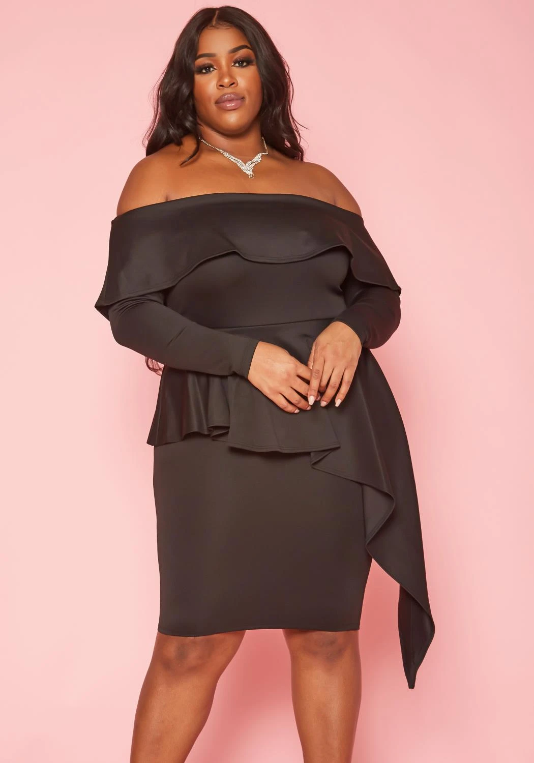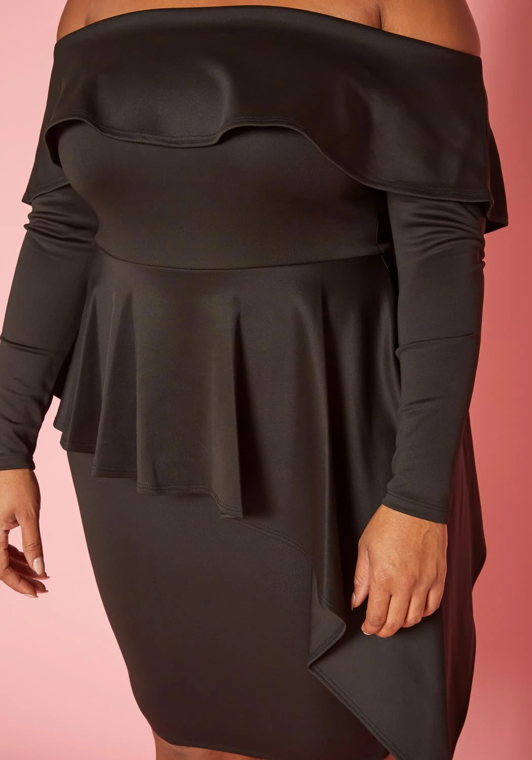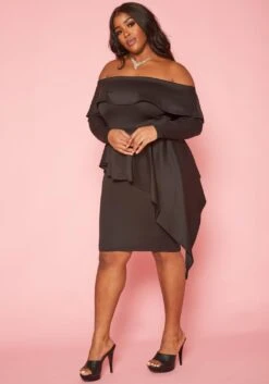 Gorgeous plus size women’s mini dress in off shoulder style, long sleeves and asymmetric peplum design.
