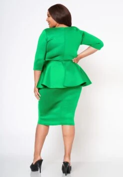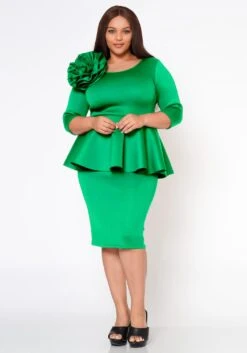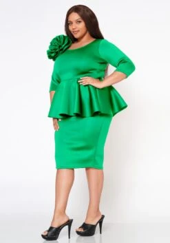 Elegant plus size women’s dress with floral shoulder decor, 3/4 long sleeves, peplum flare and quality scuba material.
