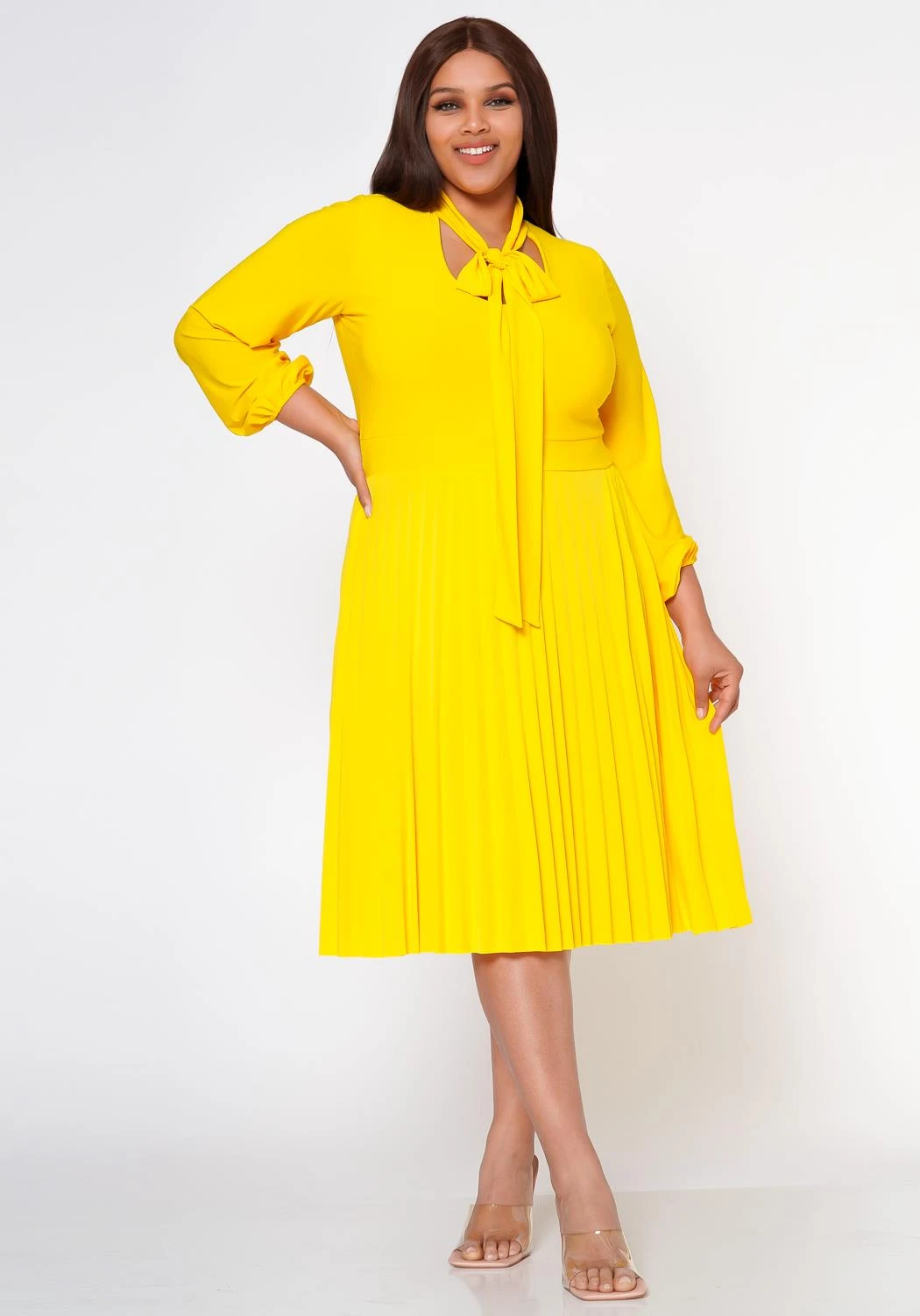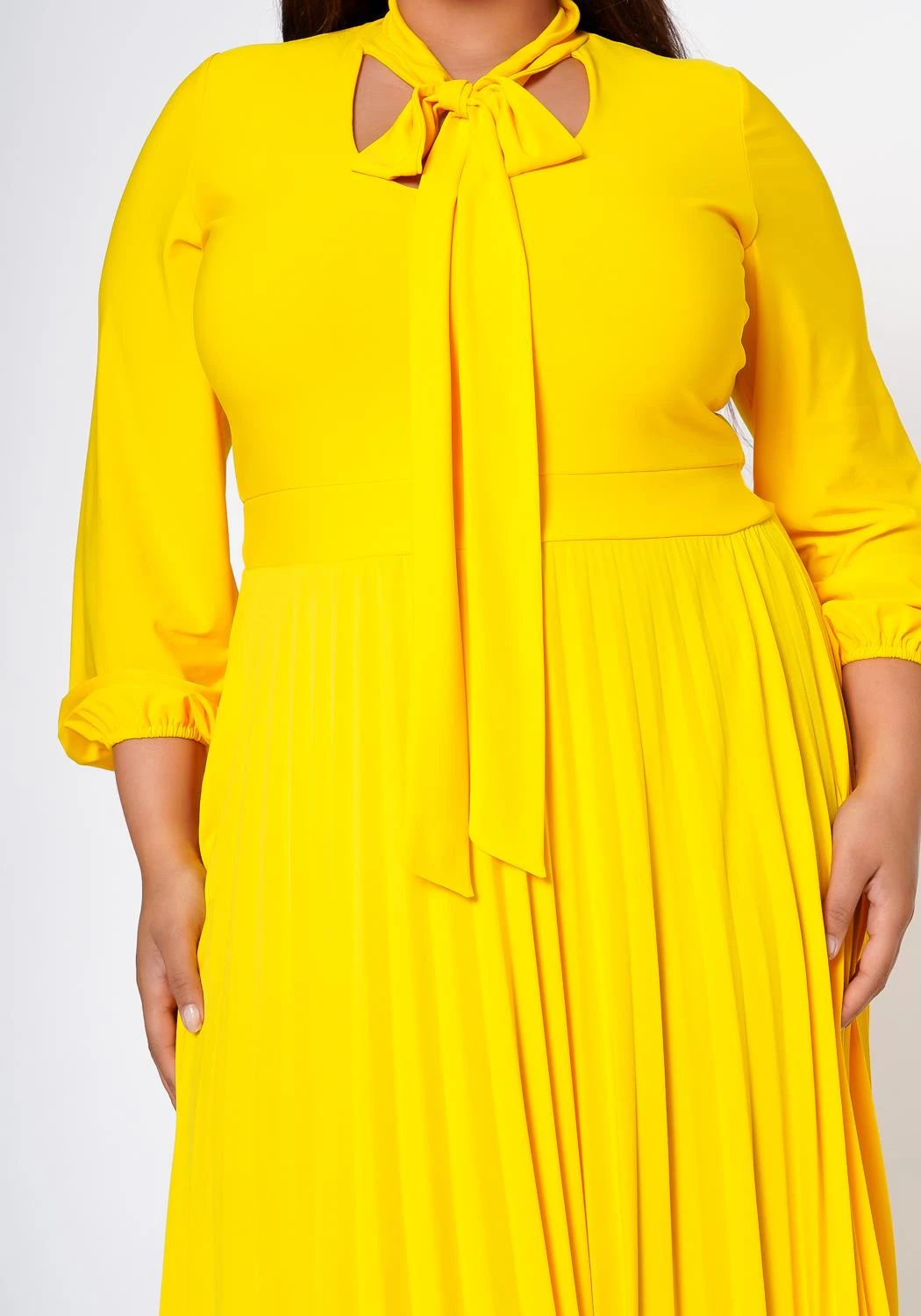 Classy plus size women’s fit & flare dress with pleated design, long sleeves, fitted wrist cuffs, bow collar ascent and v-neck cut out.