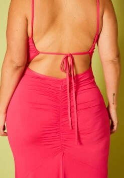 Plus size women’s dress in maxi style, featuring round neck hem, cami sleeves & back tie up closure with ruched detail.