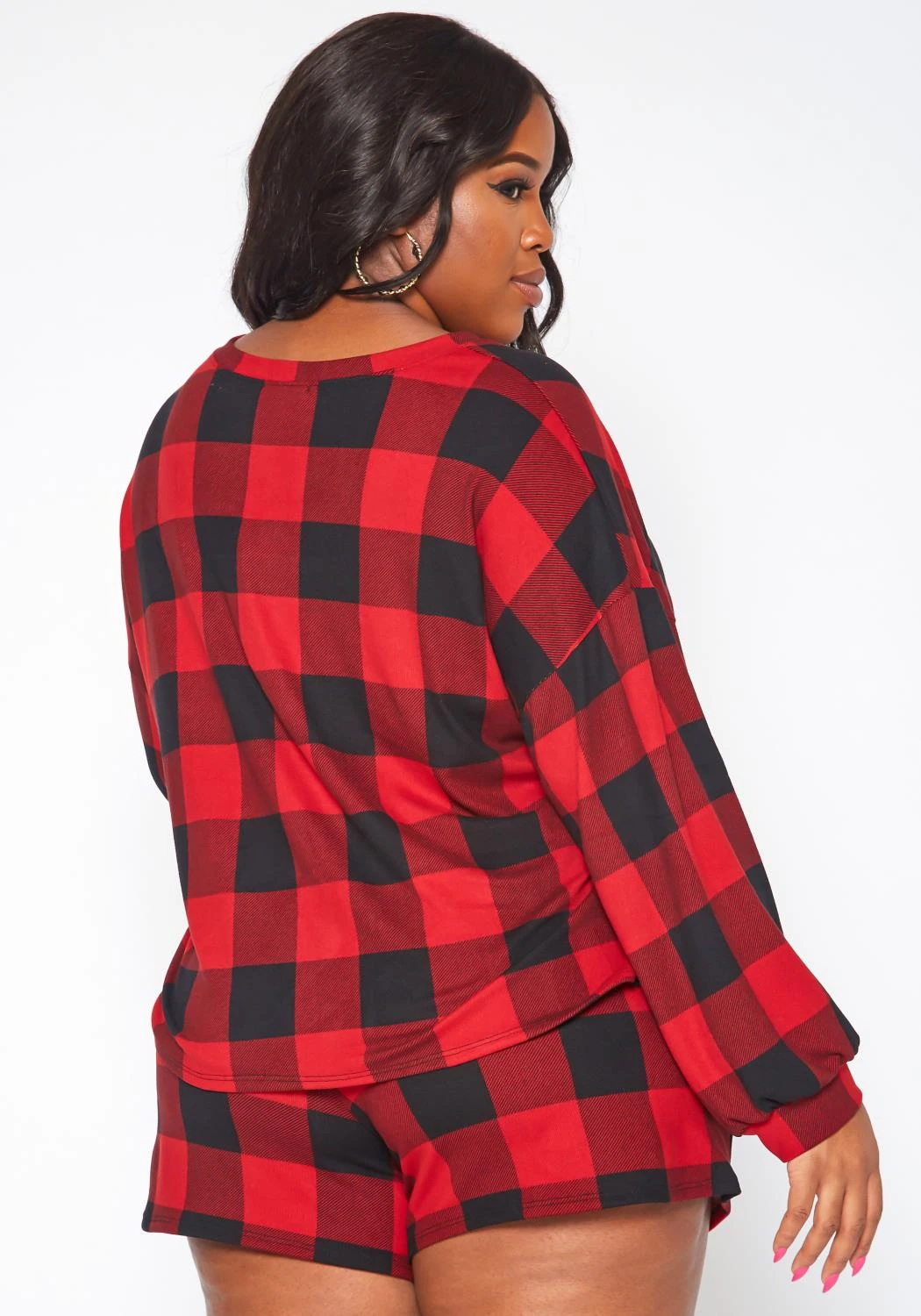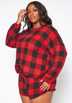 Stylish lounge set in checkered plaid print for plus size women. Features a soft, relaxed fit sweater and waistline drawstring hem shorts with pockets.
