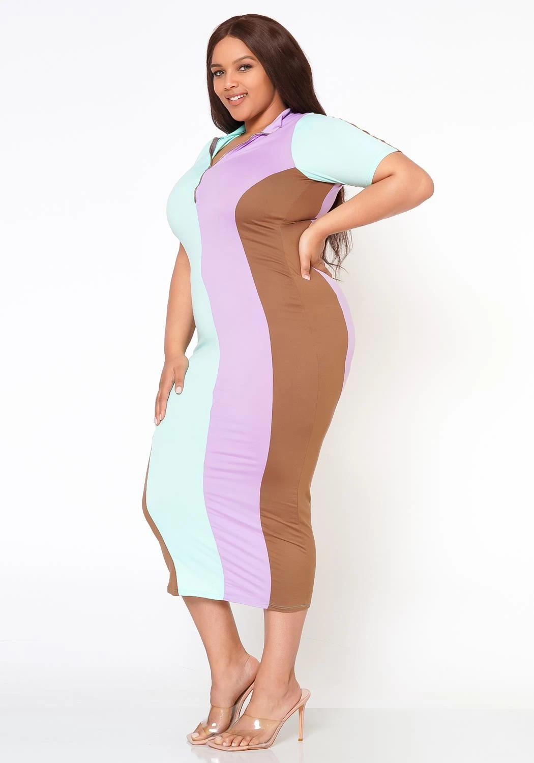 Trendy plus size women’s bodycon dress in color block design, zipper front ascent, mock neck style and short sleeves.