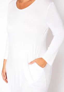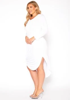 Effortless midi dress plus size women in hooded design, curved hem, fitted long sleeves, pocket hem and round neck style.