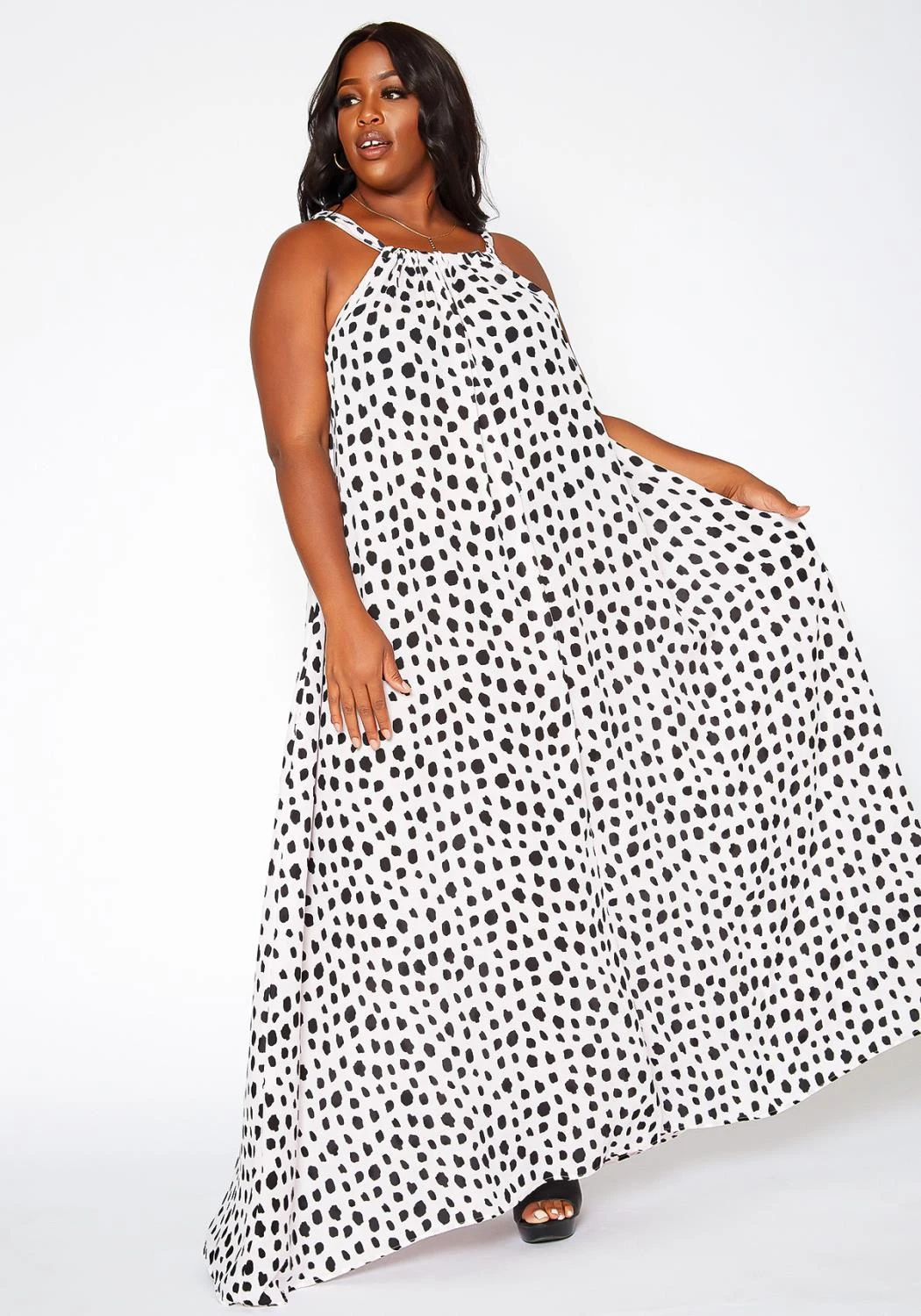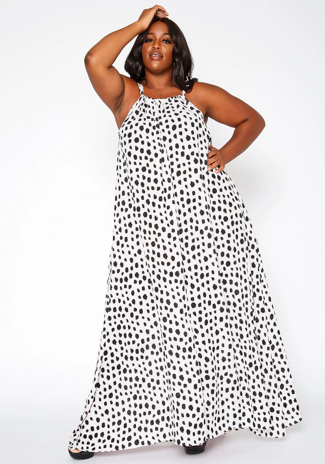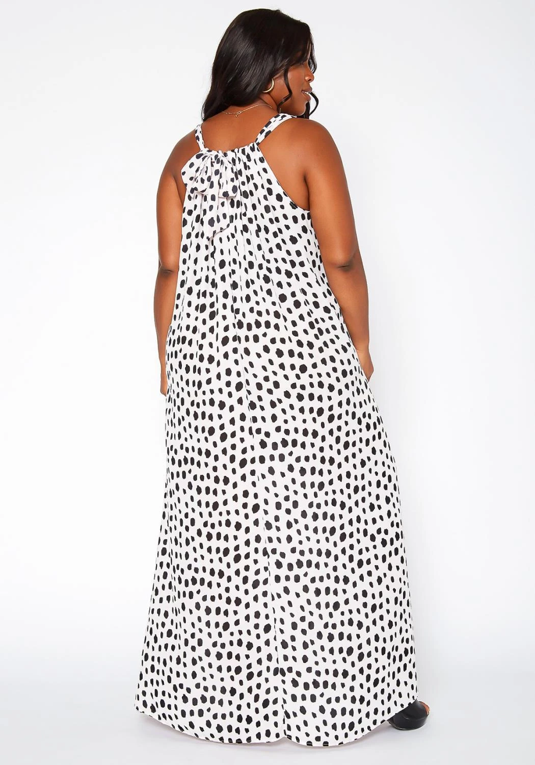 Delightful plus size women’s maxi dress in dotted pattern, sleeveless design, fit to flare end, pocket ascent and self tie closure.