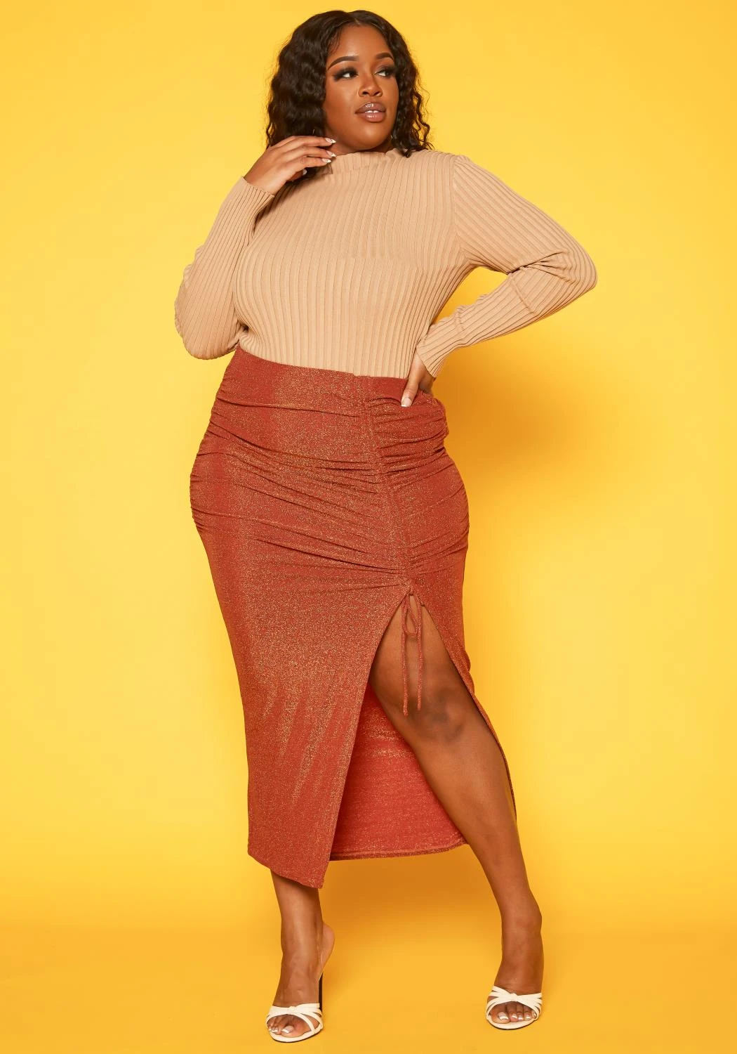 Stunning plus size women’s shimmer maxi skirt in trendy drawstring hem design, centered slit hem, high waist style and ruched details.