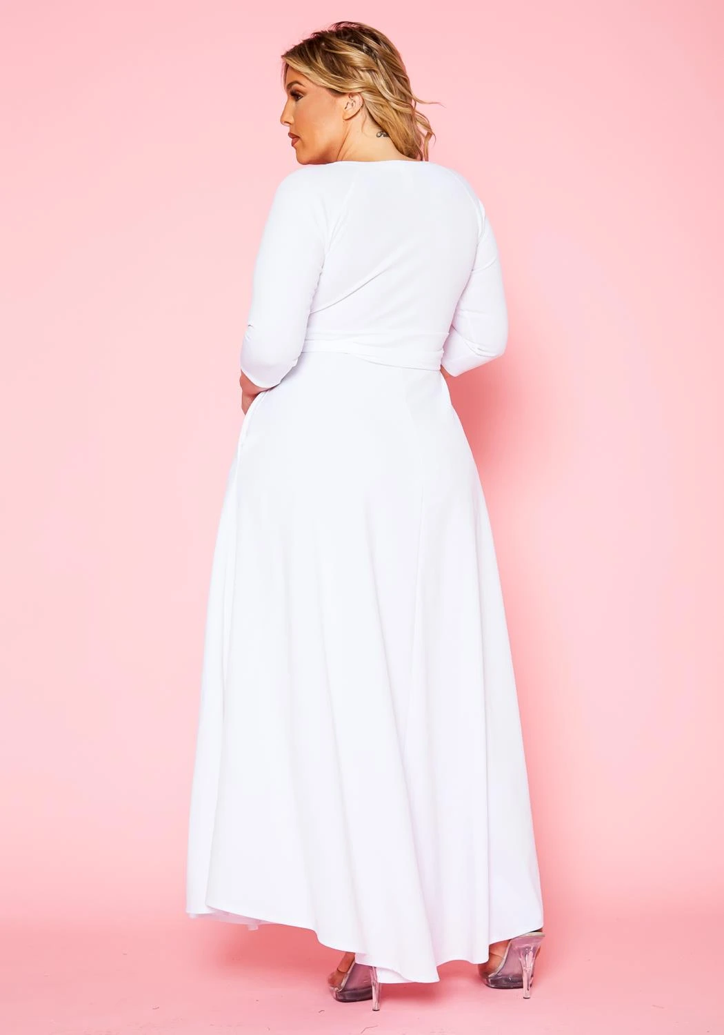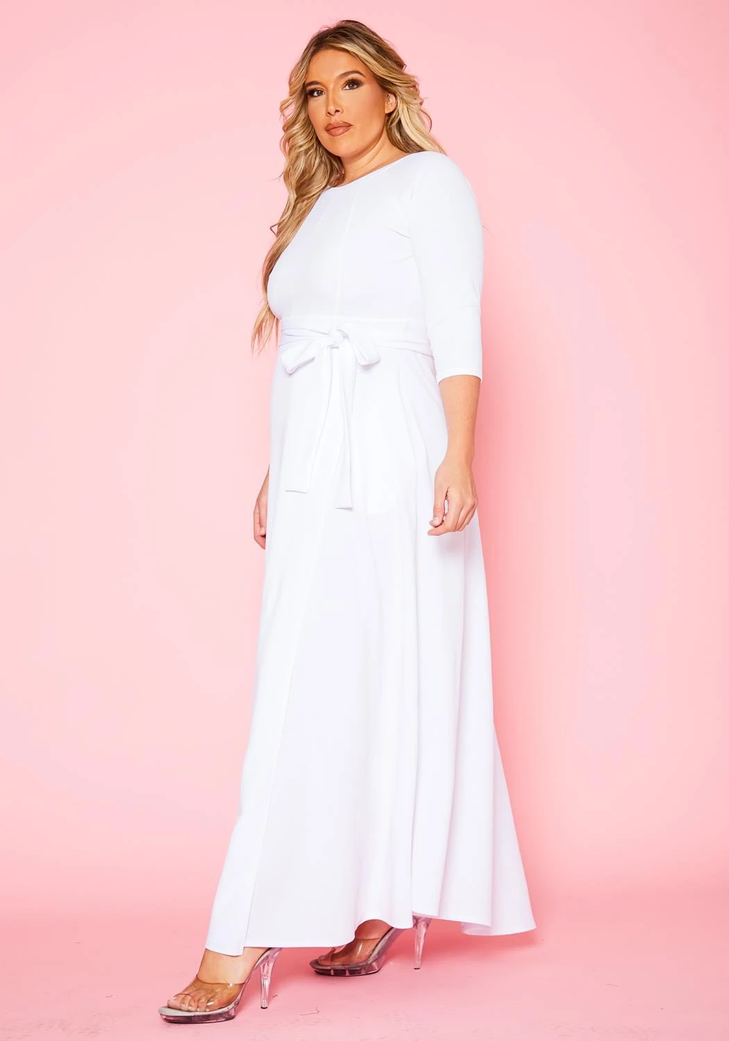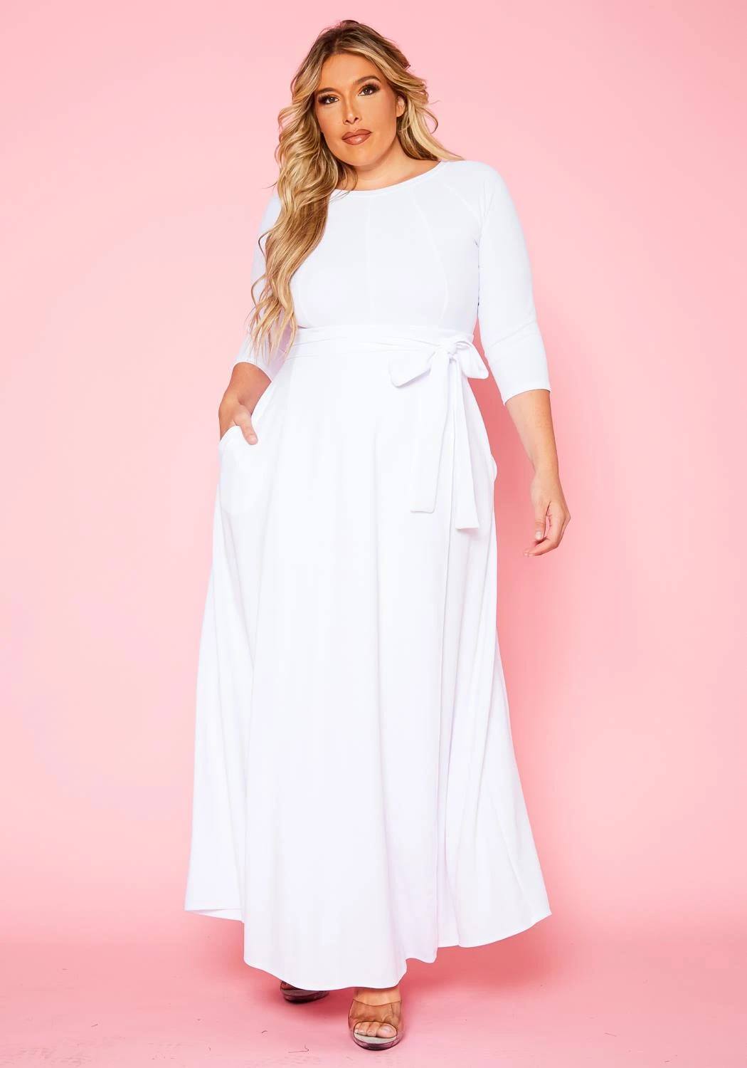 Gorgeous plus size women’s solid color maxi dress. Features fit to flare style, 3/4 fitted long sleeves, round neckline, waist tie ascent and pocket hem.