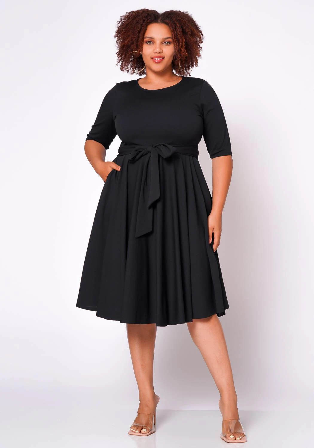 Plus size women’s dress in fit & flare style featuring a round neck hem, attached waist tie ascent, elbow sleeves and side pockets.