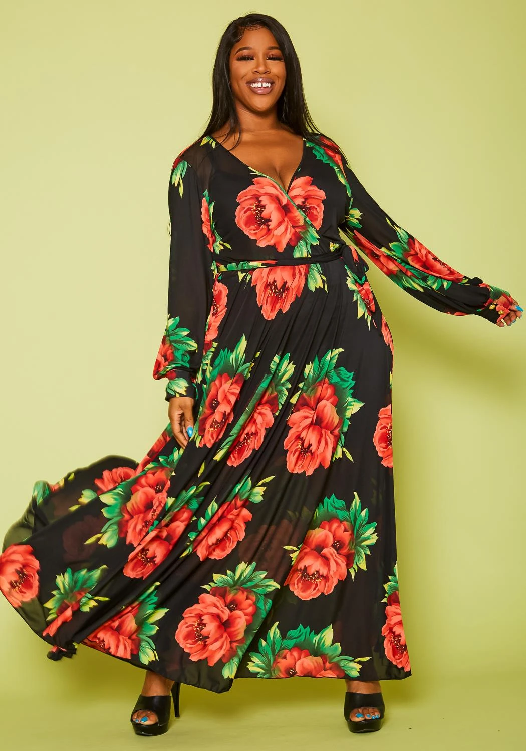 Plus size women’s dress in fit & flare style, featuring a front v-neck, long sleeve cuff hem with button details and waist tie ascent.