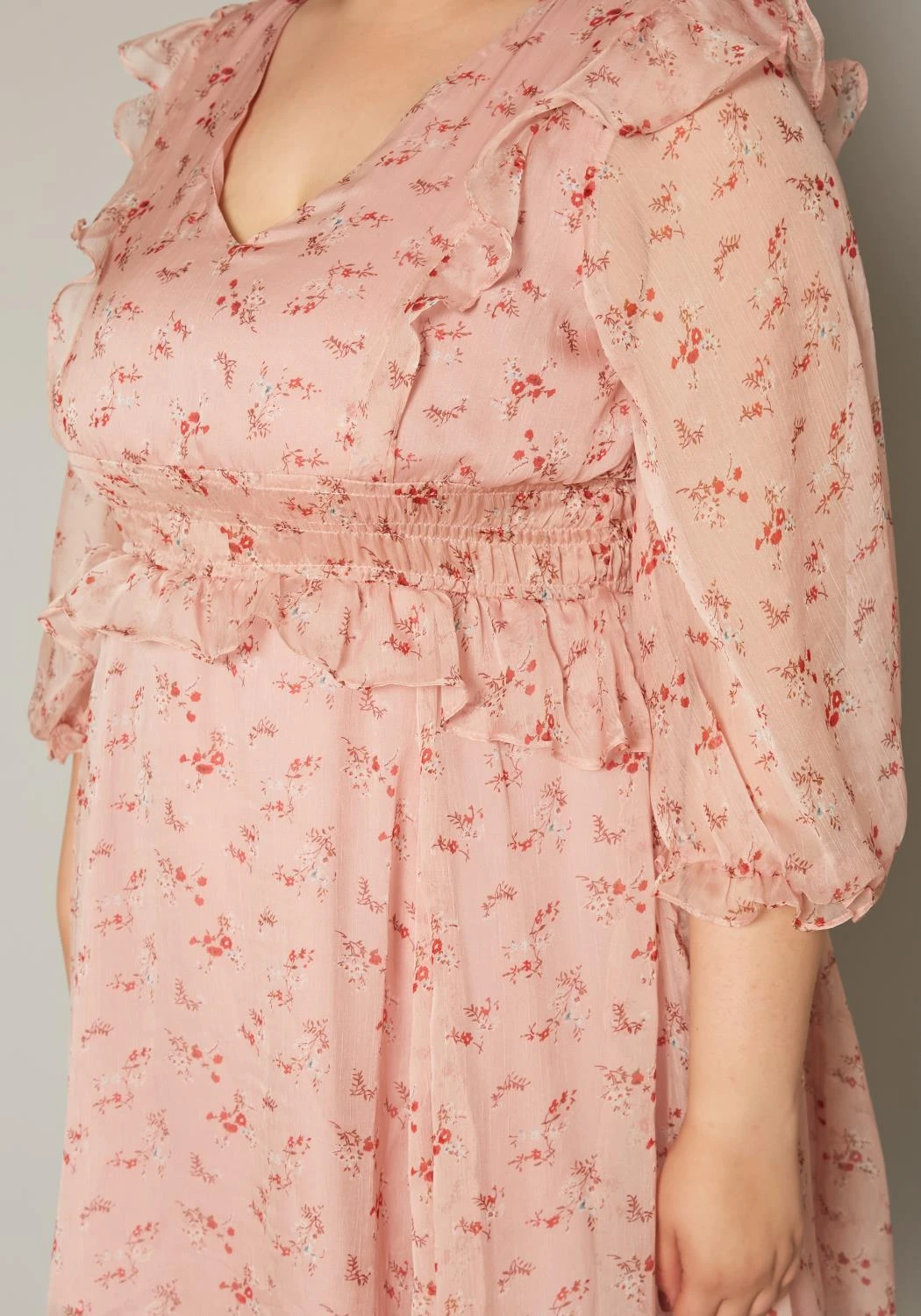 Plus size women’s mini dress in floral pattern, v-neck style, open back design, 3/4 long sleeves, ruffle trim details and chiffon style.