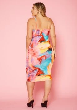 Plus size women’s midi tank dress in flower pattern style, featuring a side cut out with drawstring detail, scoop neck style & cami shoulder straps.