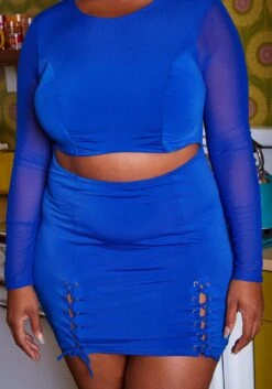 Flirty plus size women’s bodycon mini dress with front cut-out hem, double cross-lace details, mesh long sleeves and round neck style.
