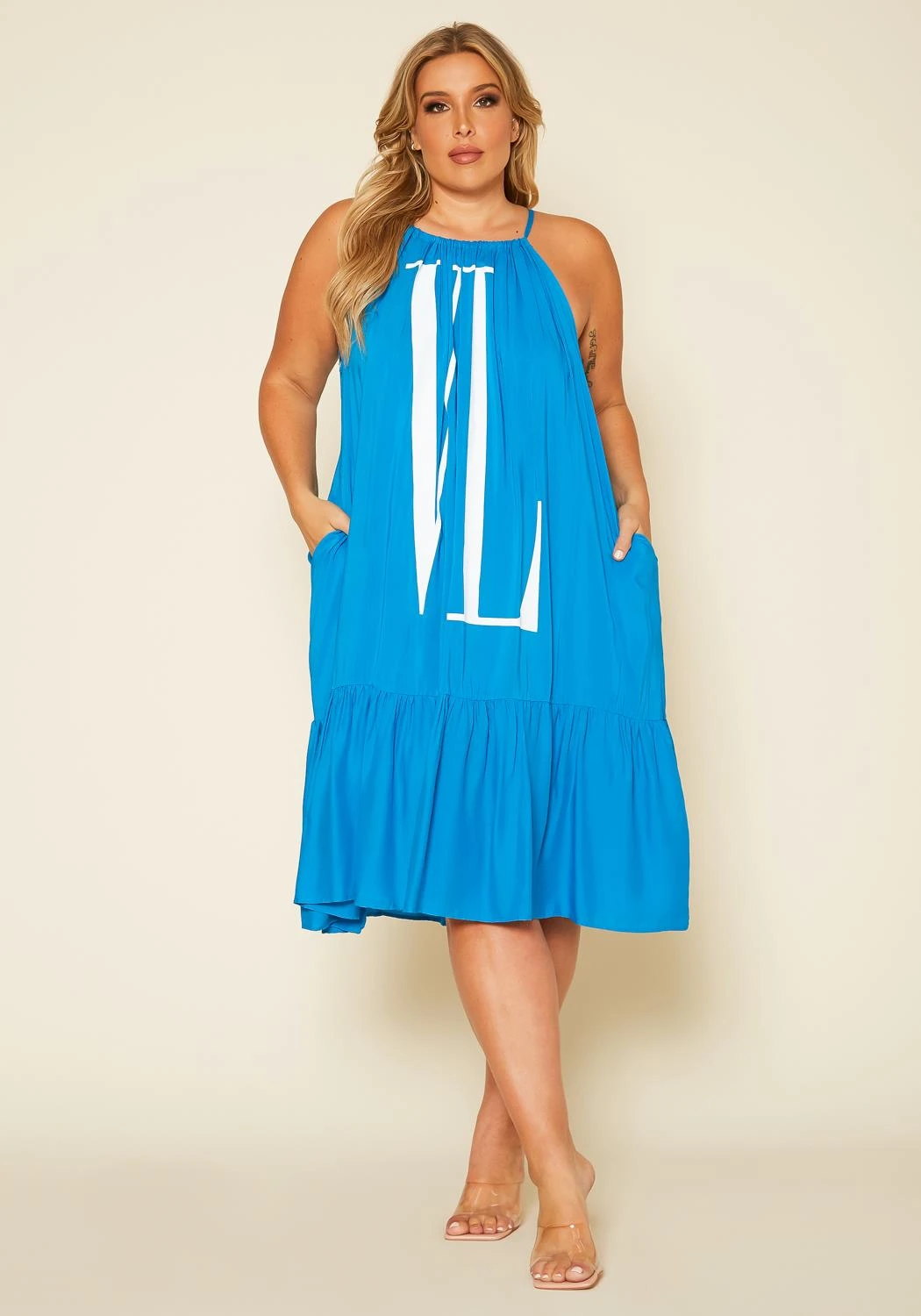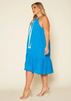 Plus size women’s dress in halter style, featuring a graphic front and back detail ” VL”, tiered hem & drawstring tie up closure.