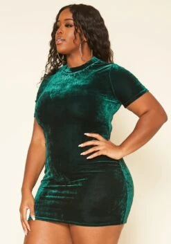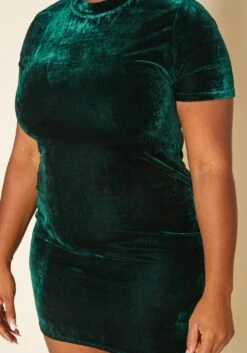 Effortless plus size women’s velvet mini dress in short sleeve style, mock neck and bodycon fitting.