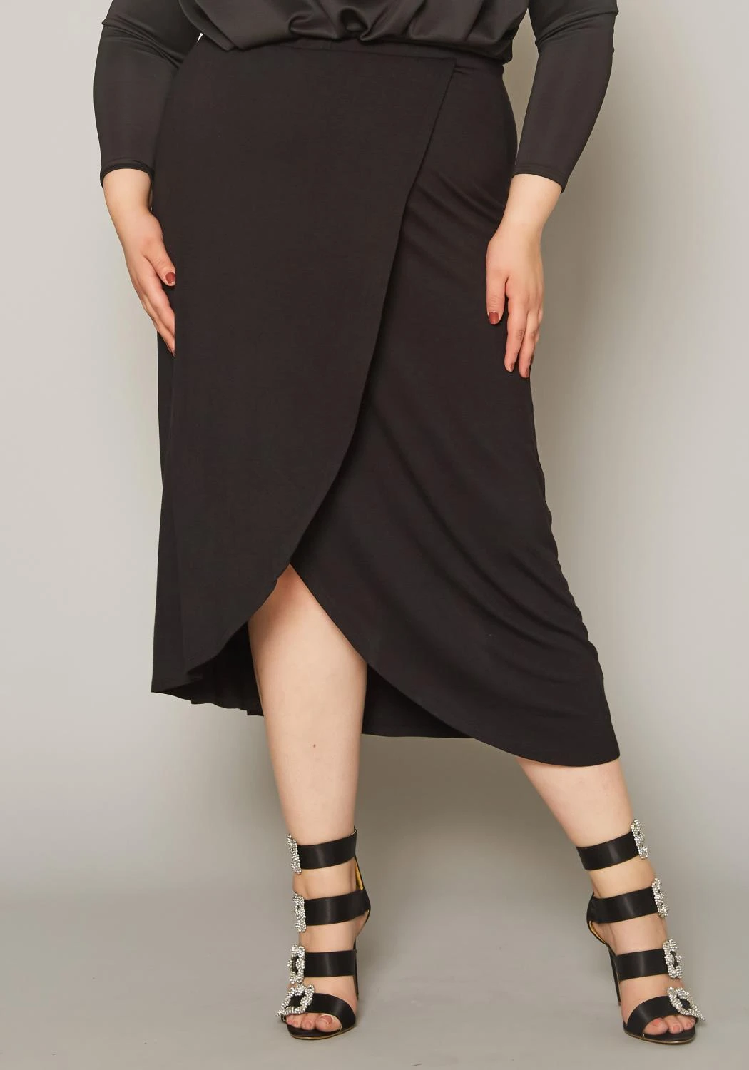 Essential plus size women’s midi skirt in high waist style, overlay hem design and flare end.