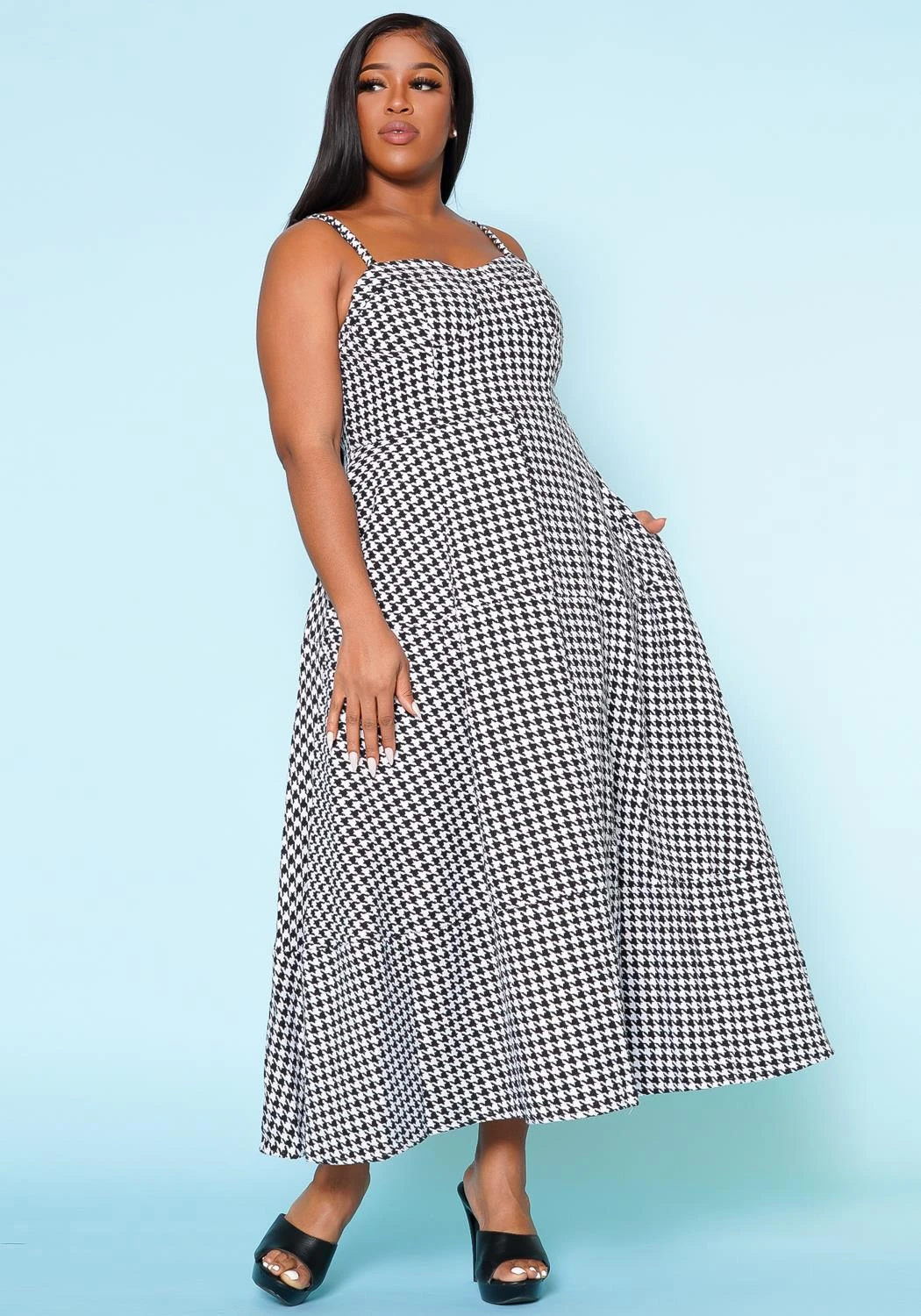 Plus size women’s maxi dress in houndstooth pattern, cami shoulder straps, sweetheart neckline and back zipper closure.