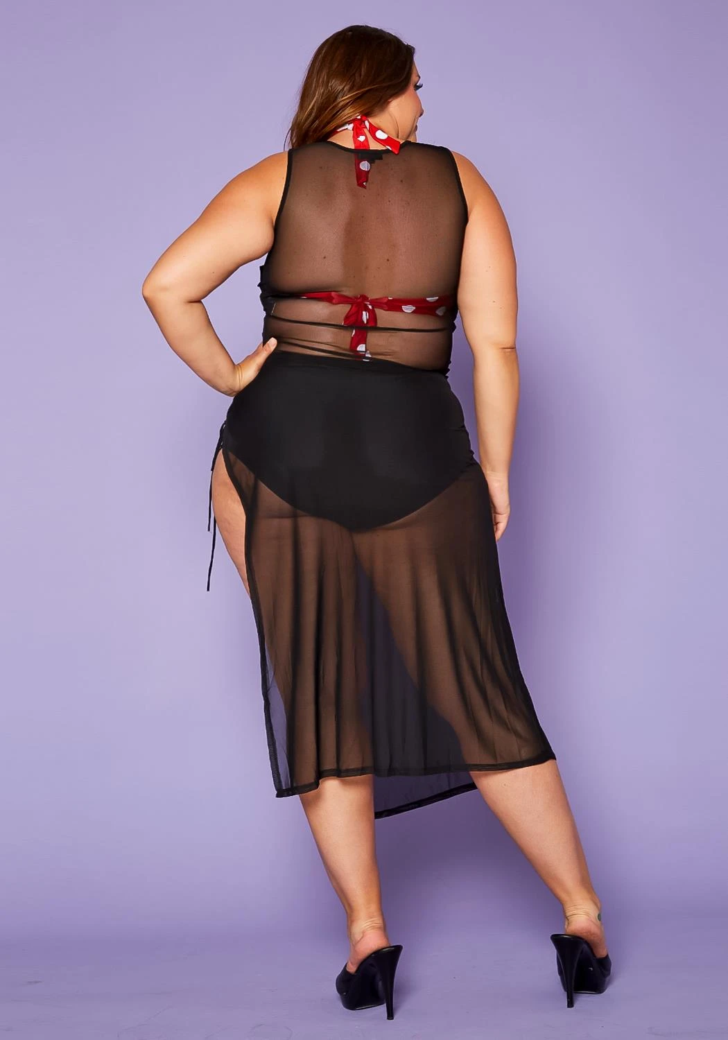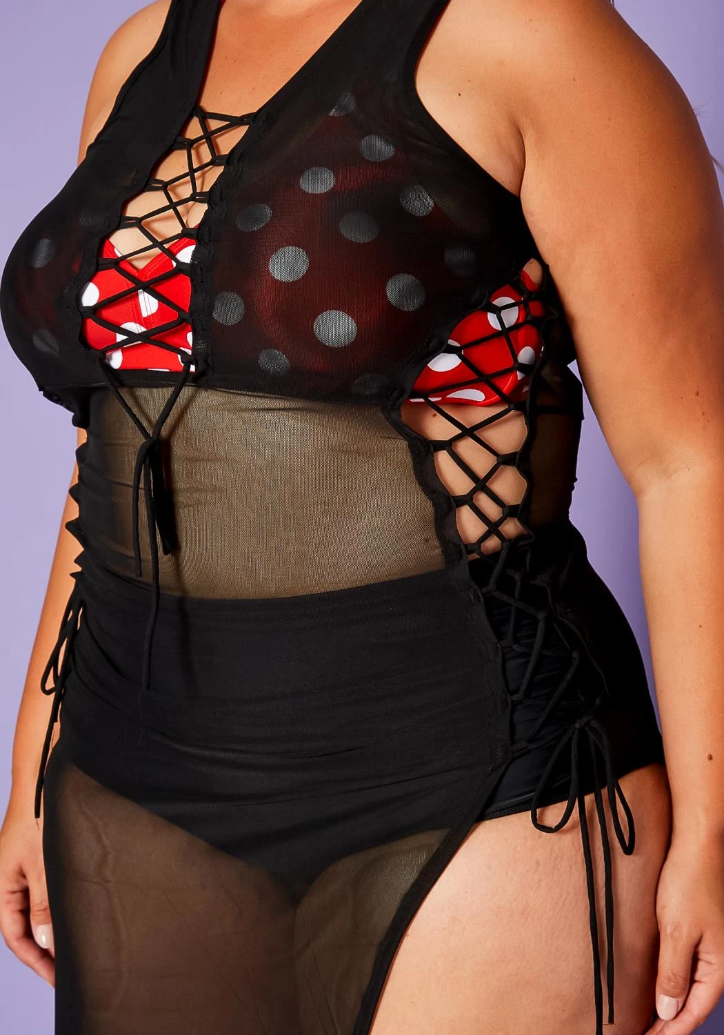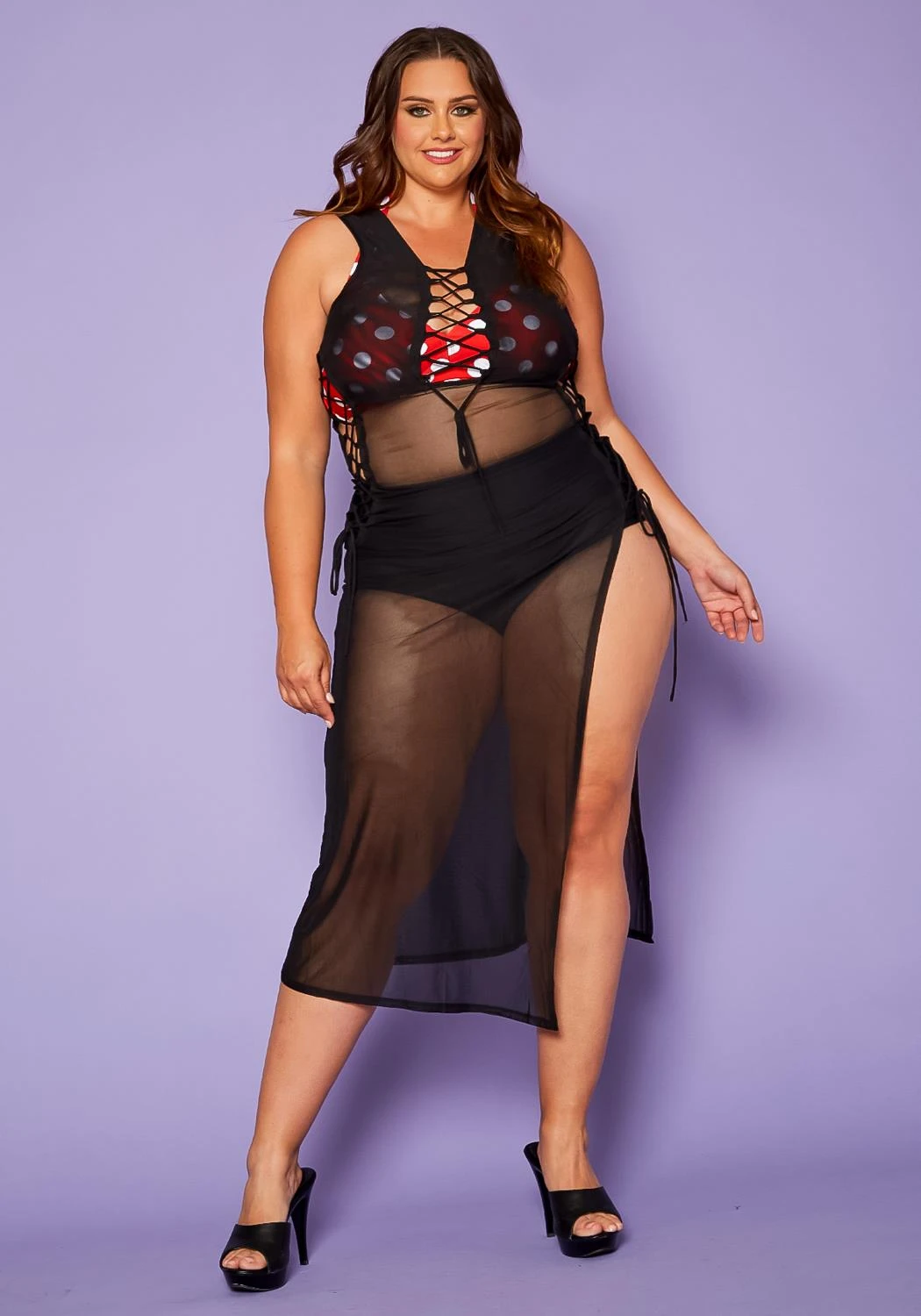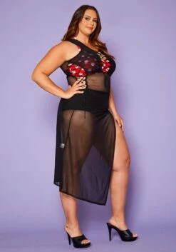 Plus size women’s dress in cover up style featuring a front & side tie up detail, mesh style, & side slit ascent.