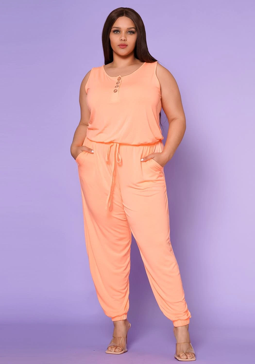Plus size women’s jumpsuit in sleeveless style featuring round neck ascent, front button closure detail, elastic waistband ascent and drawstring detail.
