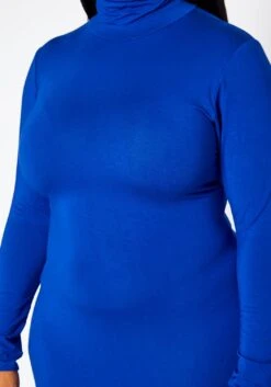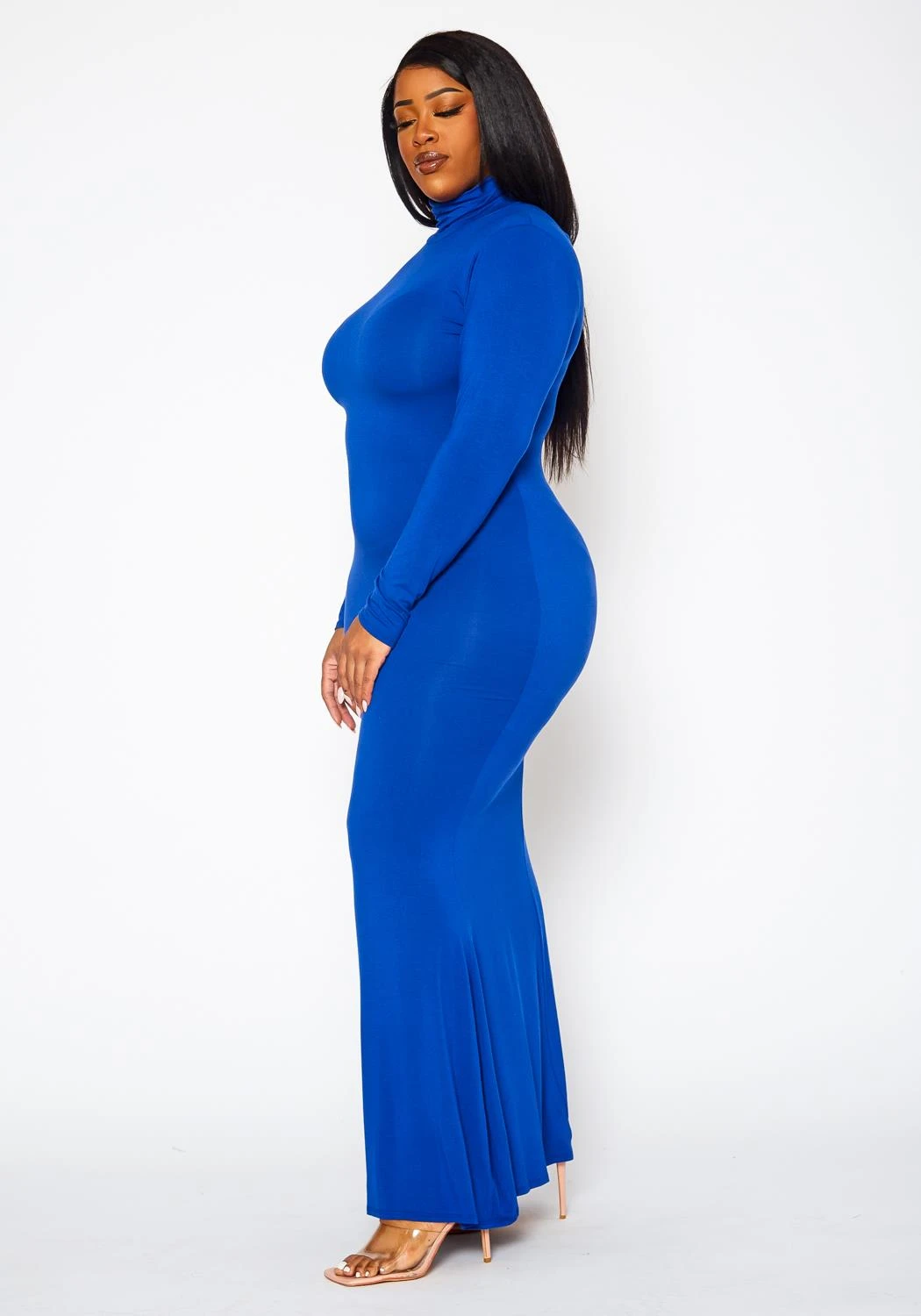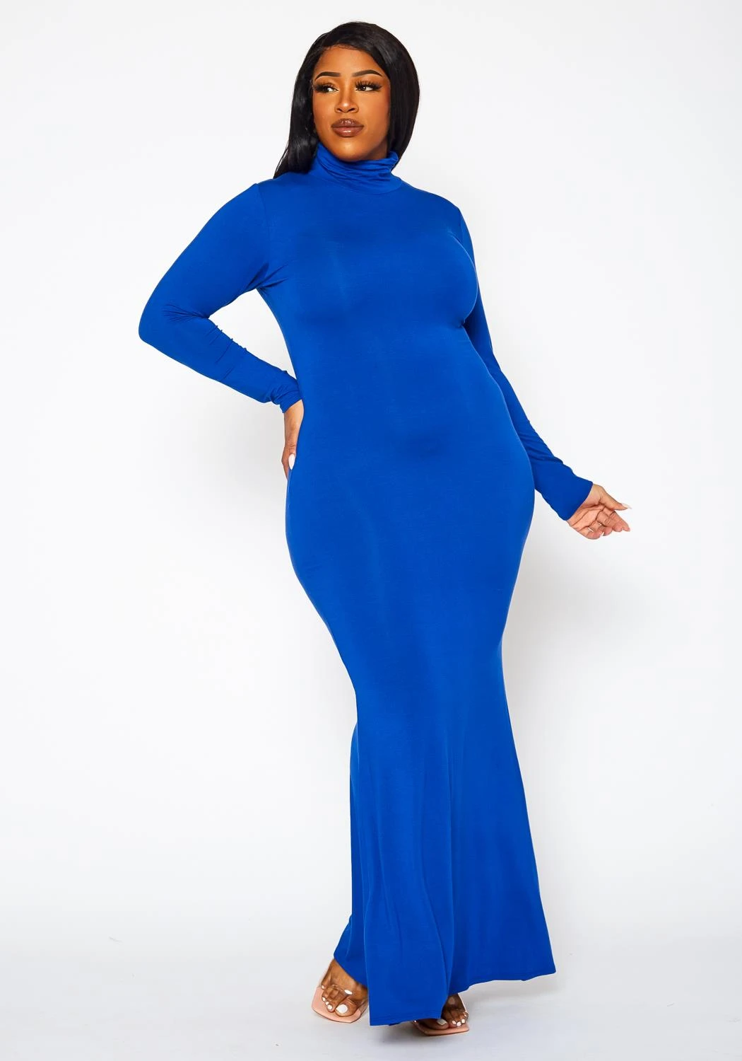 Simply effortless plus size women’s maxi dress with mermaid flare hem, fitted long sleeves and mock neck style.