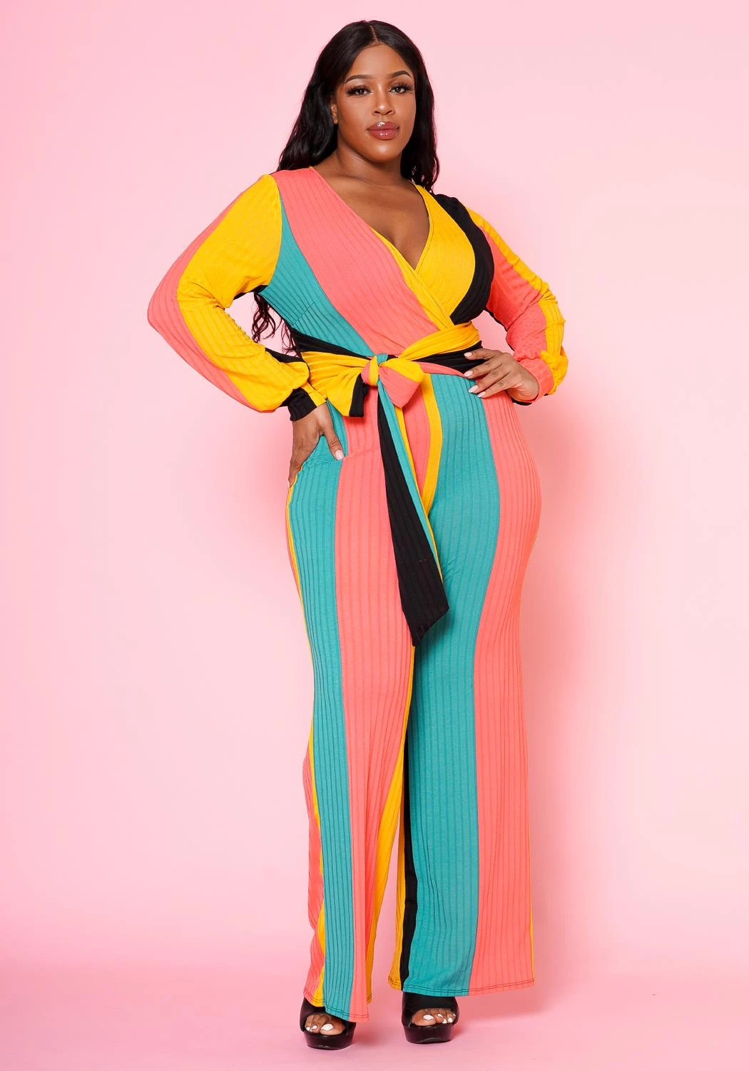 Effortless plus size women’s jumpsuit in multi color pattern, comfy ribbed material, v-neck style, long sleeves, waist tie hem and flare leg hem.
