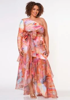 Outgoing plus size women’s maxi skirt in multi print, high waist hem and fitted to mesh ruffled flare design. Matching top sold separately.