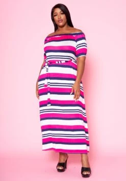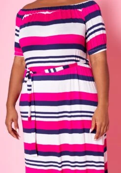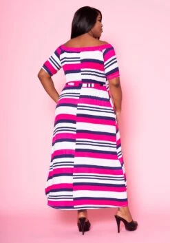 Plus size women’s maxi dress in multi striped pattern, waist tie ascent, boat neckline and short sleeves.