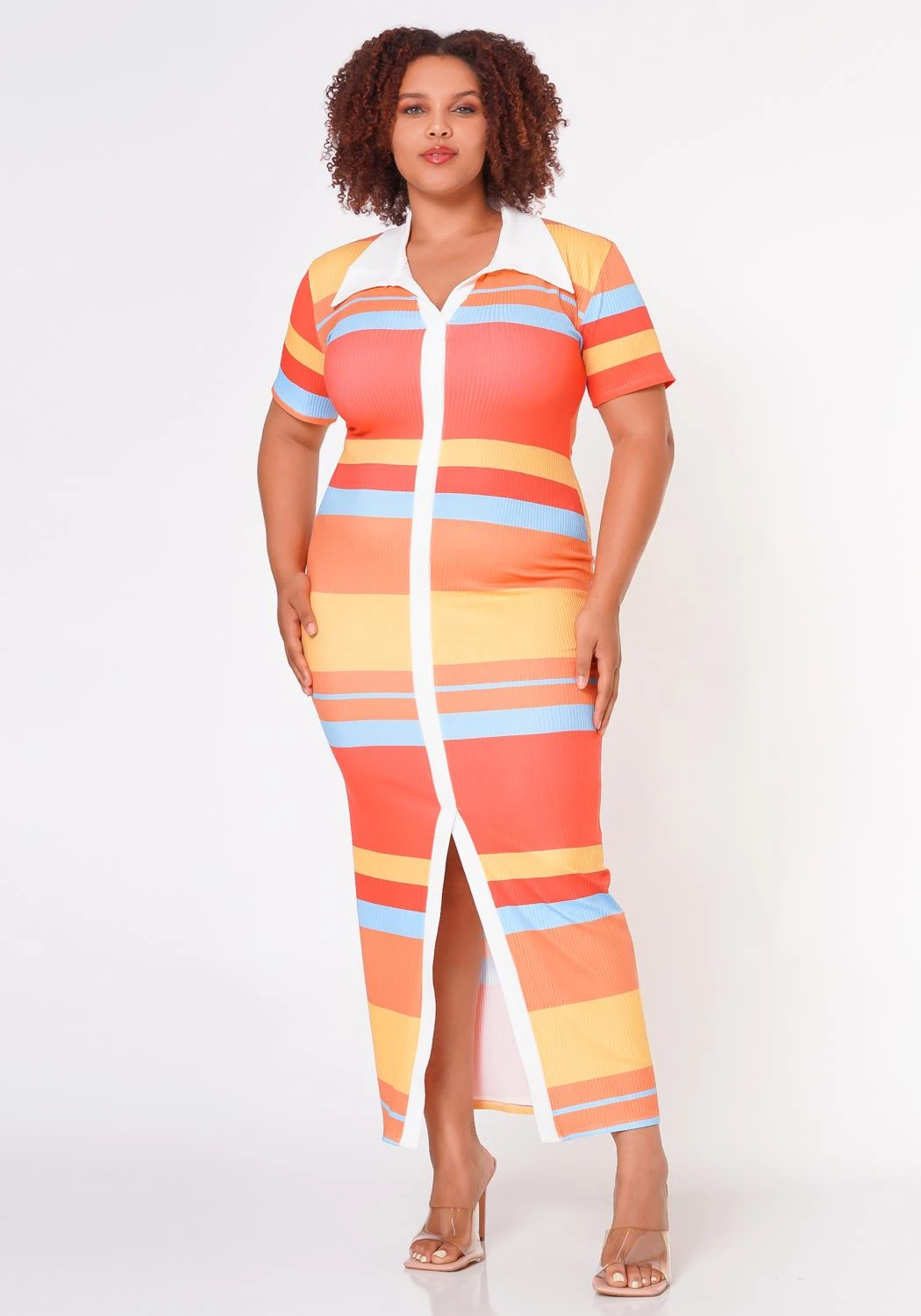 Plus size woman’s beautiful maxi dress striped print pattern featuring collar neck style, short sleeves and a slit hem detail.