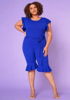 Plus size woman’s biker romper with ruffle detailing a round neck and waist tie accent.