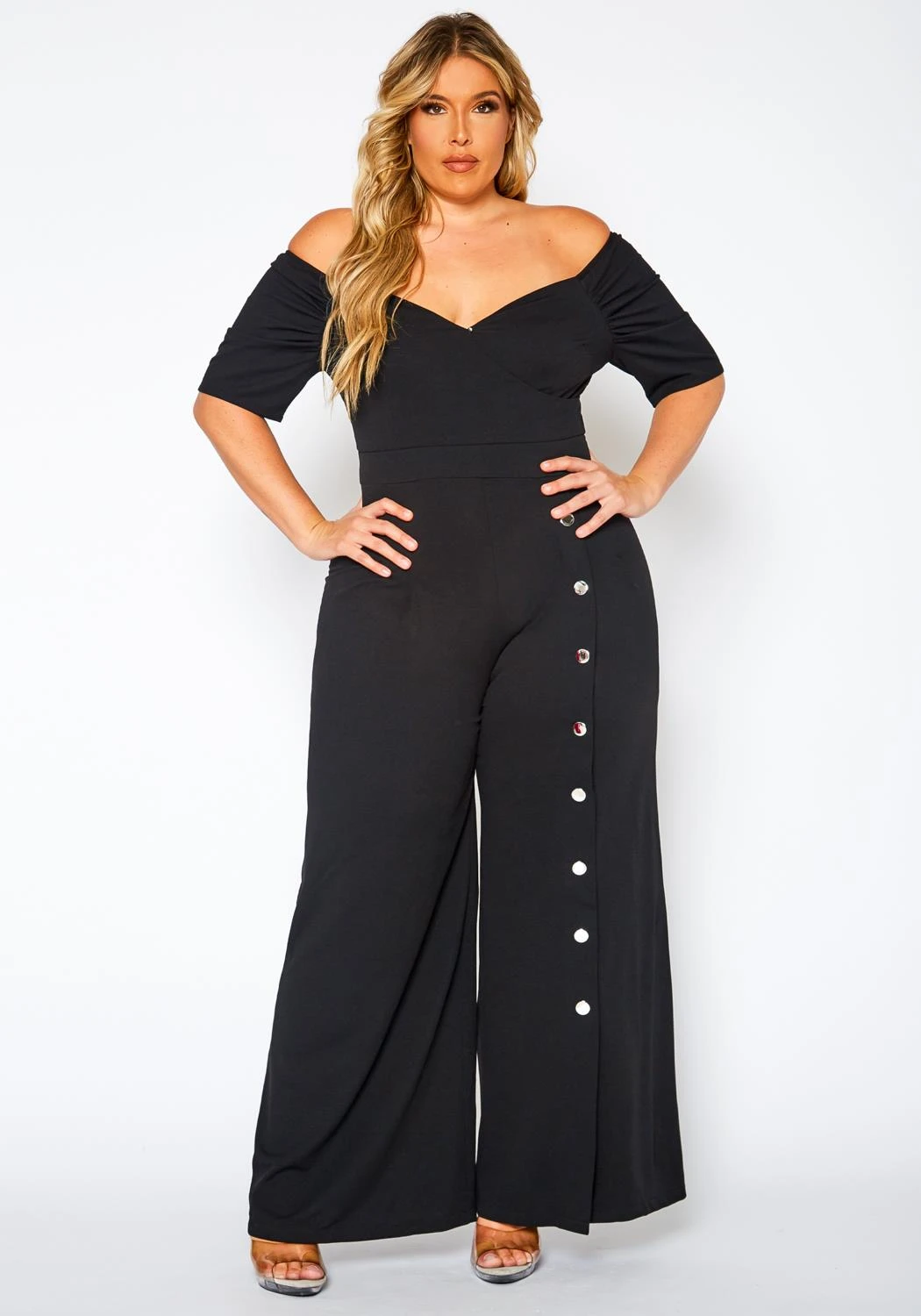 Plus Size women’s jumpsuit in off shoulder style, featuring silver buttons ascent, flared leg style, back zipper closure.