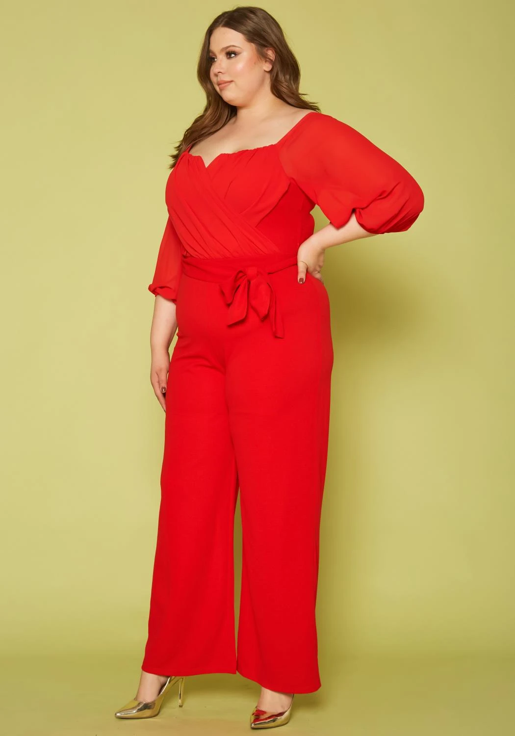 Enjoy a classy lady look with Asoph’s romantic jumpsuit for plus size women. Features a sheer draped front effect, wired v-slit hem, sheer 3/4 long sleeves with elastic wrist cuffs and opaque contrast bottom material with flare leg design. Includes matching waist tie.