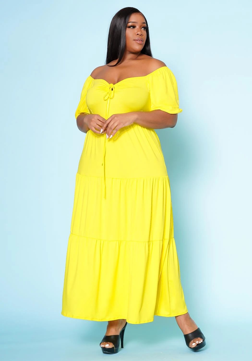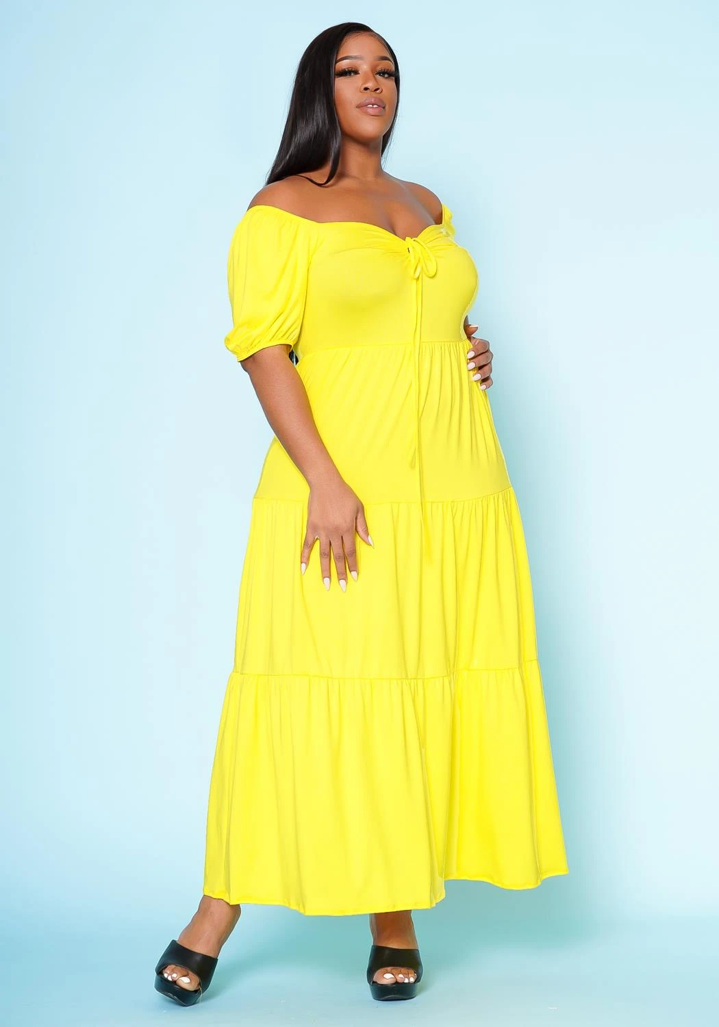 Gorgeous plus size women’s fit to flare maxi dress in off shoulder design, short sleeves, button front lining and bow tie ascent.
