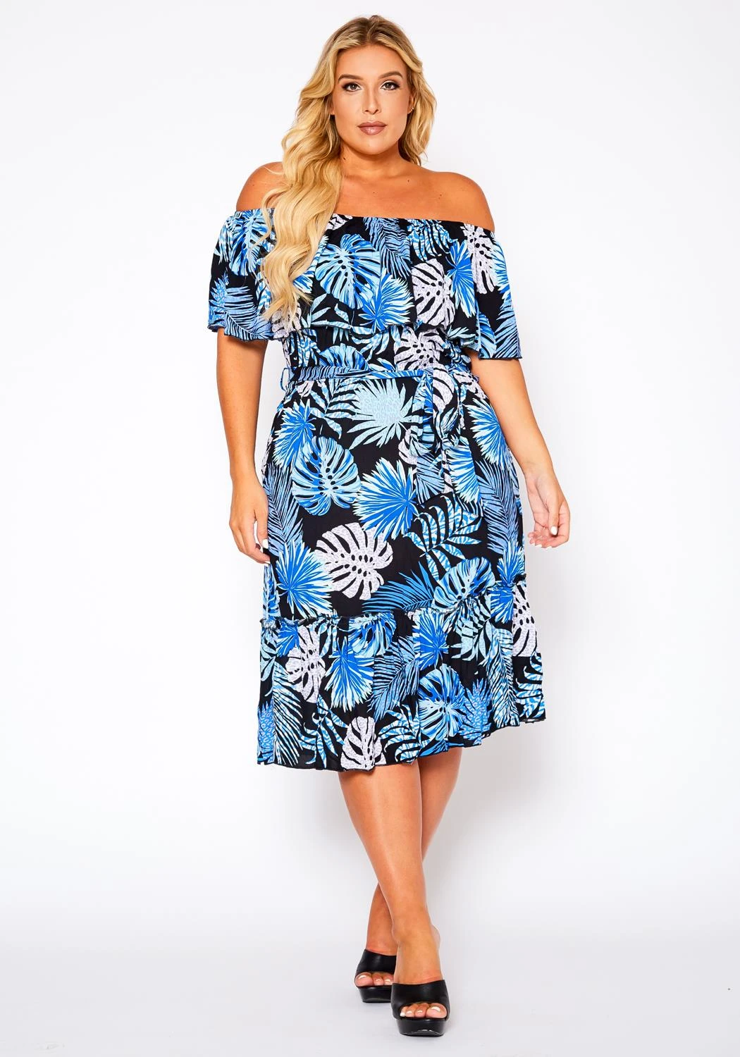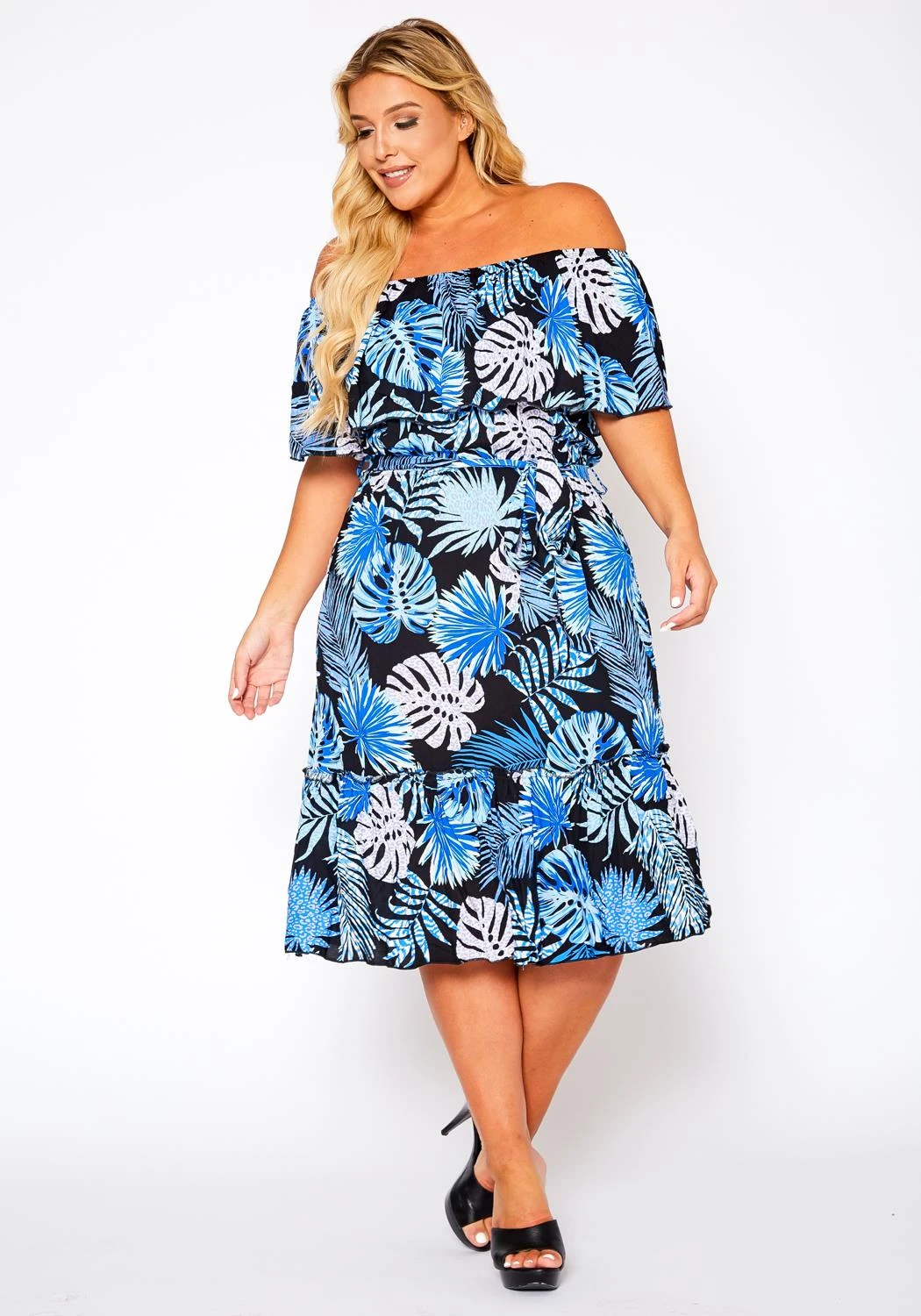 Perfect vacation plus size women’s dress, featuring off shoulder hem, elastic waist detail with detachable waist tie up ascent, side loop holes & tiered hem.