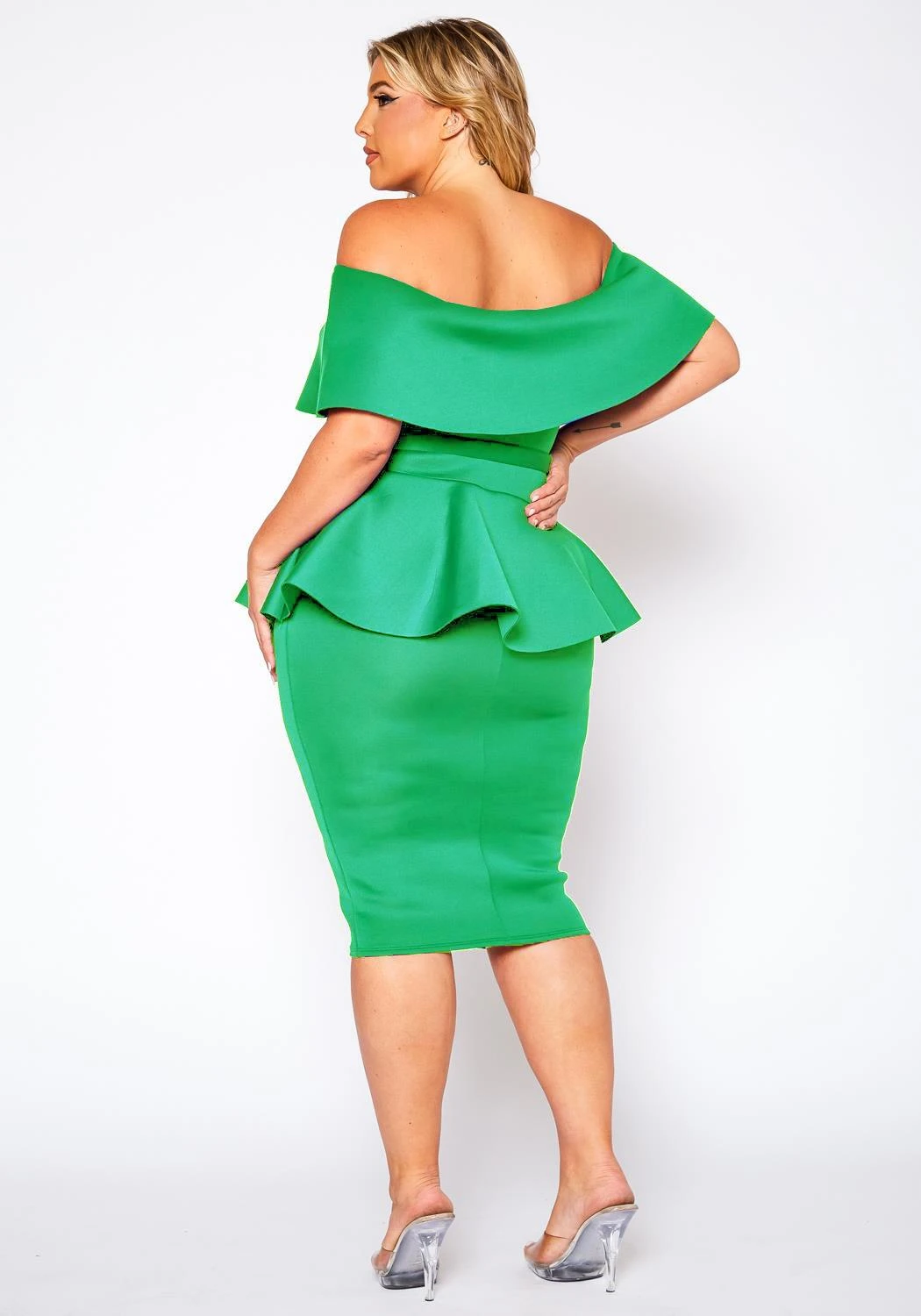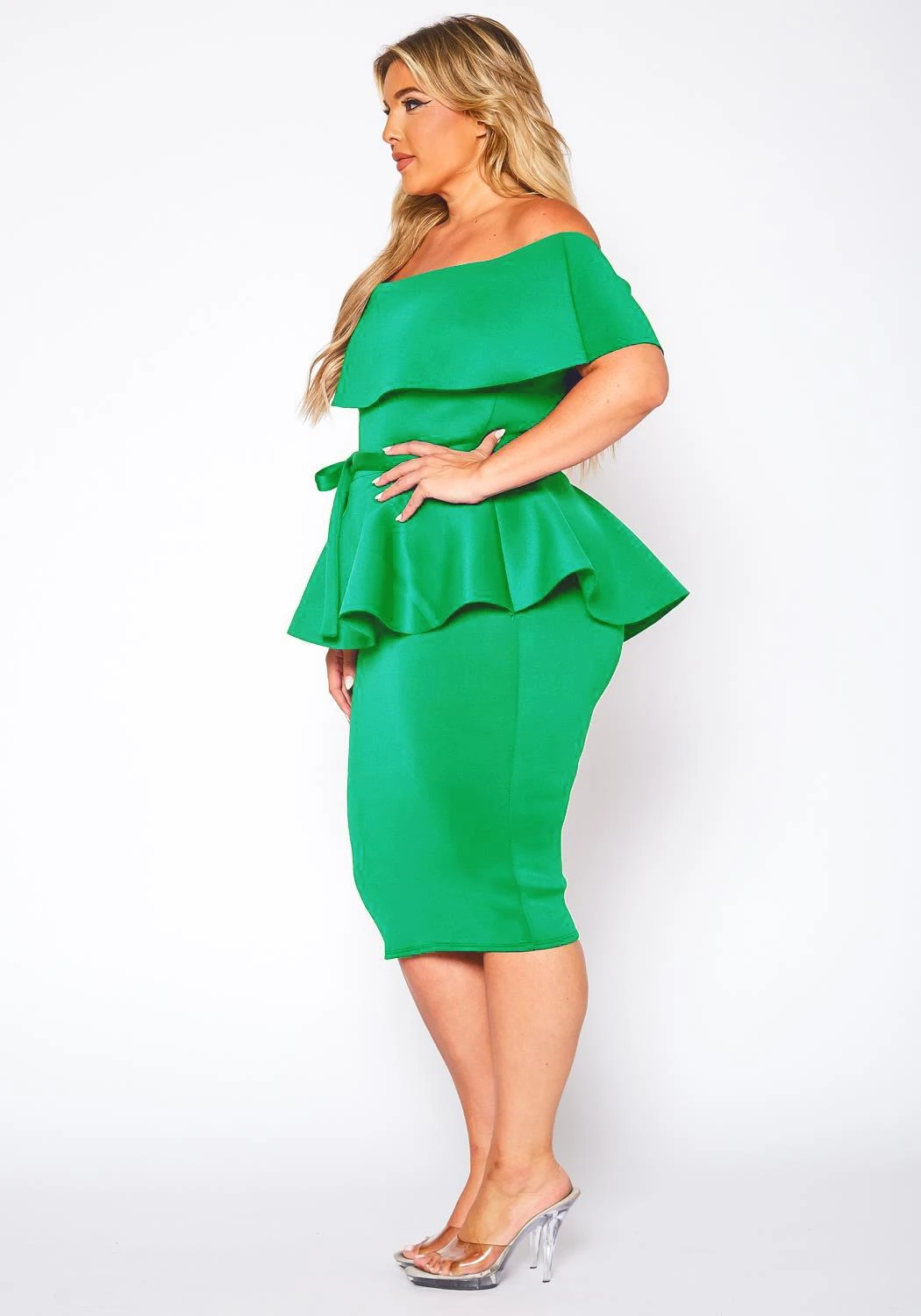 Plus size dress in peplum style, featuring a off shoulder hem, bodycon fit & a detachable waist tie up detail.