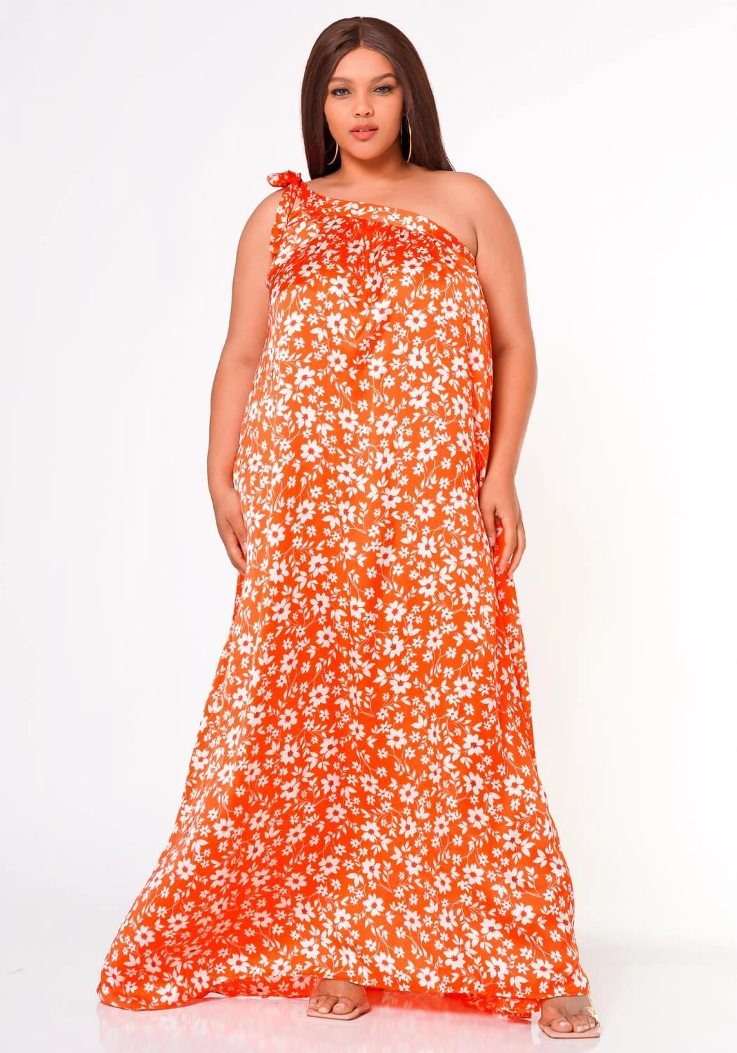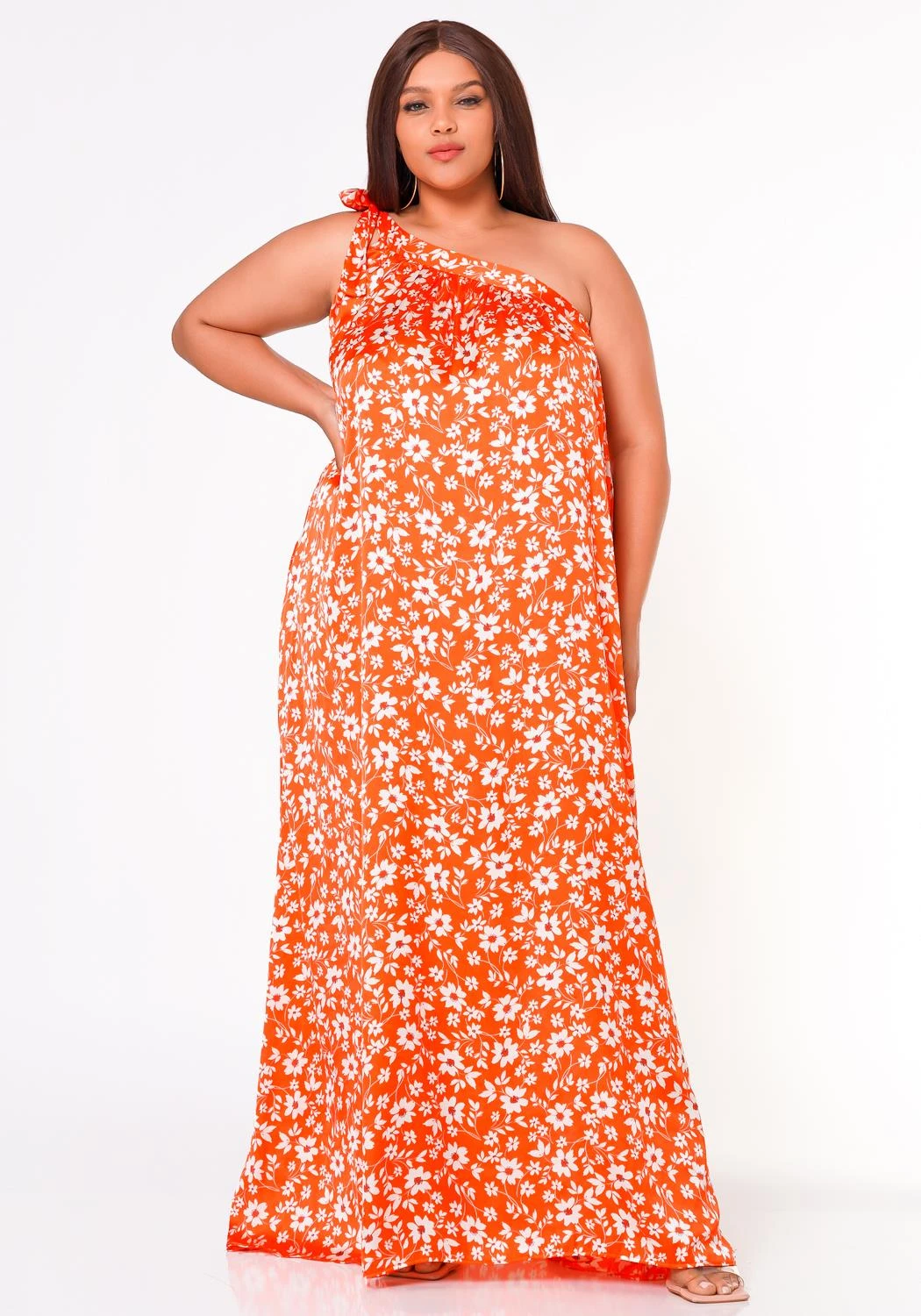 Plus size women’s maxi dress featuring a one sleeve self tie hem with side pocket detail and floral pattern.