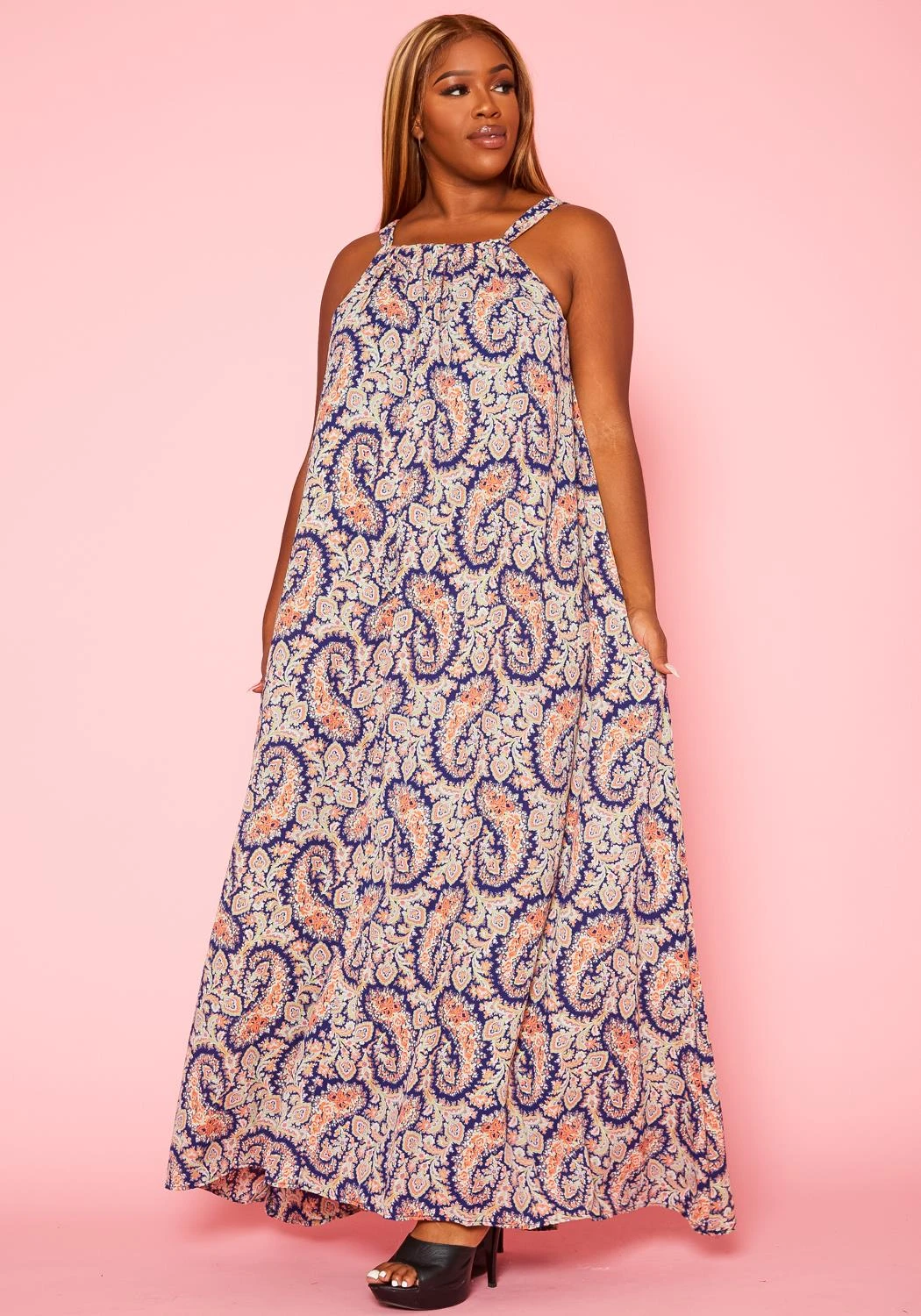 Delightful plus size women’s maxi dress in paisley pattern, sleeveless design, fit to flare end, pocket ascent and self tie closure.