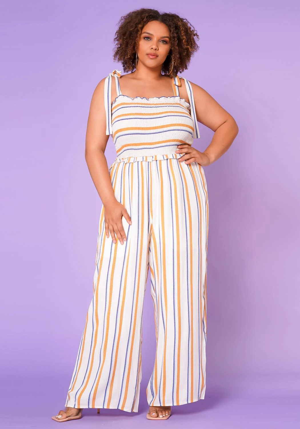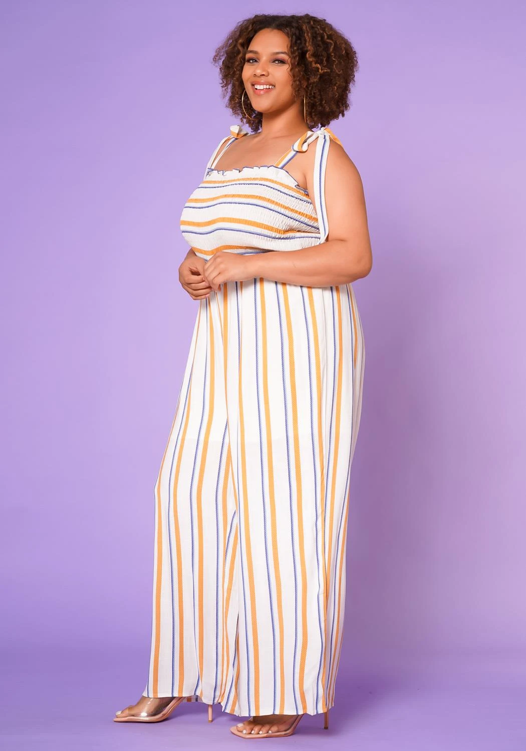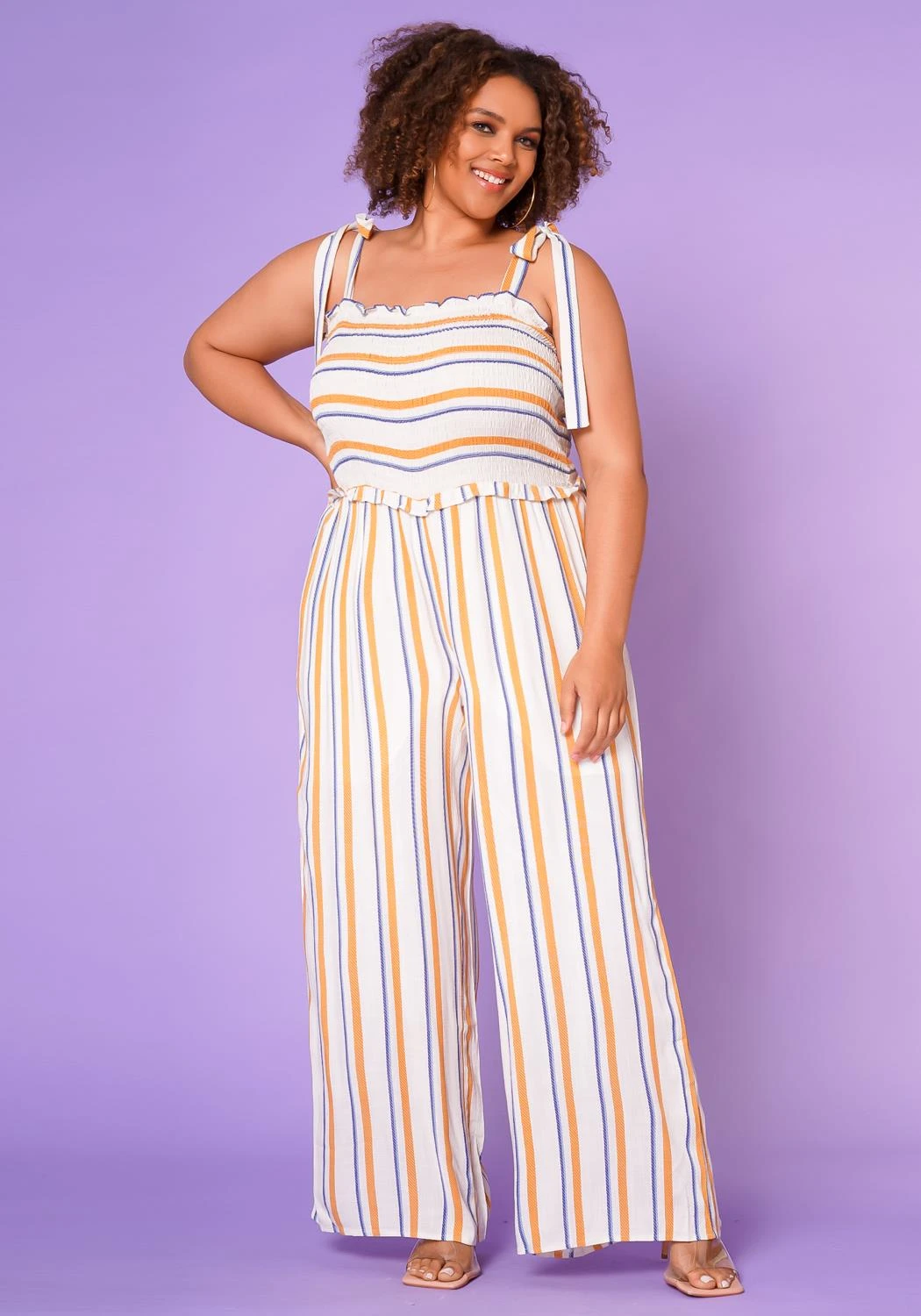 Casual plus size women jumpsuit featuring a multi striped print and smocked top.