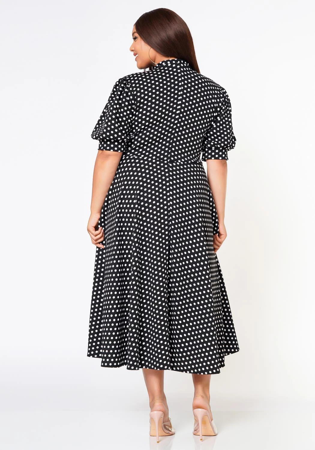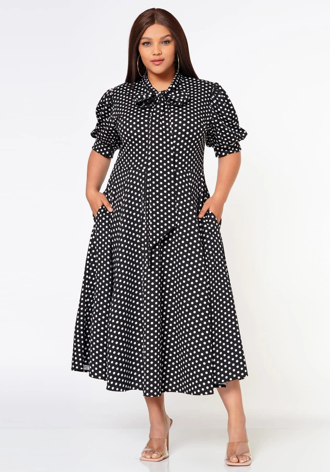 Pretty plus size women’s polka dot midi dress in fit to flare design, collar bow tie ascent, short puff sleeves and pocket hem.
