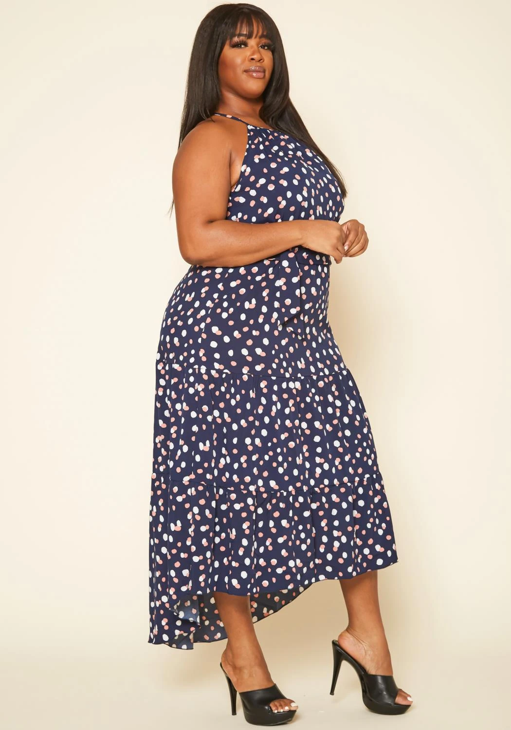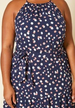 Plus size women’s maxi dress in polka dot print, flare design and waist tie ascent.