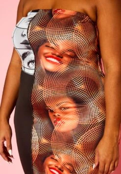 Make a statement in this eye-catching tube dress featuring a playful pop art face print. The bold, colorful print adds a fun and unique touch to this classic silhouette. The dress is made with a high-quality stretchy fabric that hugs your curves in all the right places, while the back slit hem adds an extra element of style and movement. Perfect for a night out with friends or a date, this dress is sure to turn heads and make you feel confident and fabulous. Available in a range of plus sizes, this dress is a must-have addition to your wardrobe.