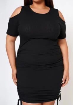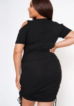 You can’t go wrong with our gorgeous bodycon mini dress which features a comfy ribbed knit material, cold shoulder design, short sleeves, round neckline and double sided functional drawstring add ons.