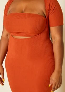 Plus size women’s dress in maxi style, featuring ribbed design, very low round neckline paired with a bandeau, short sleeves and body con fit.