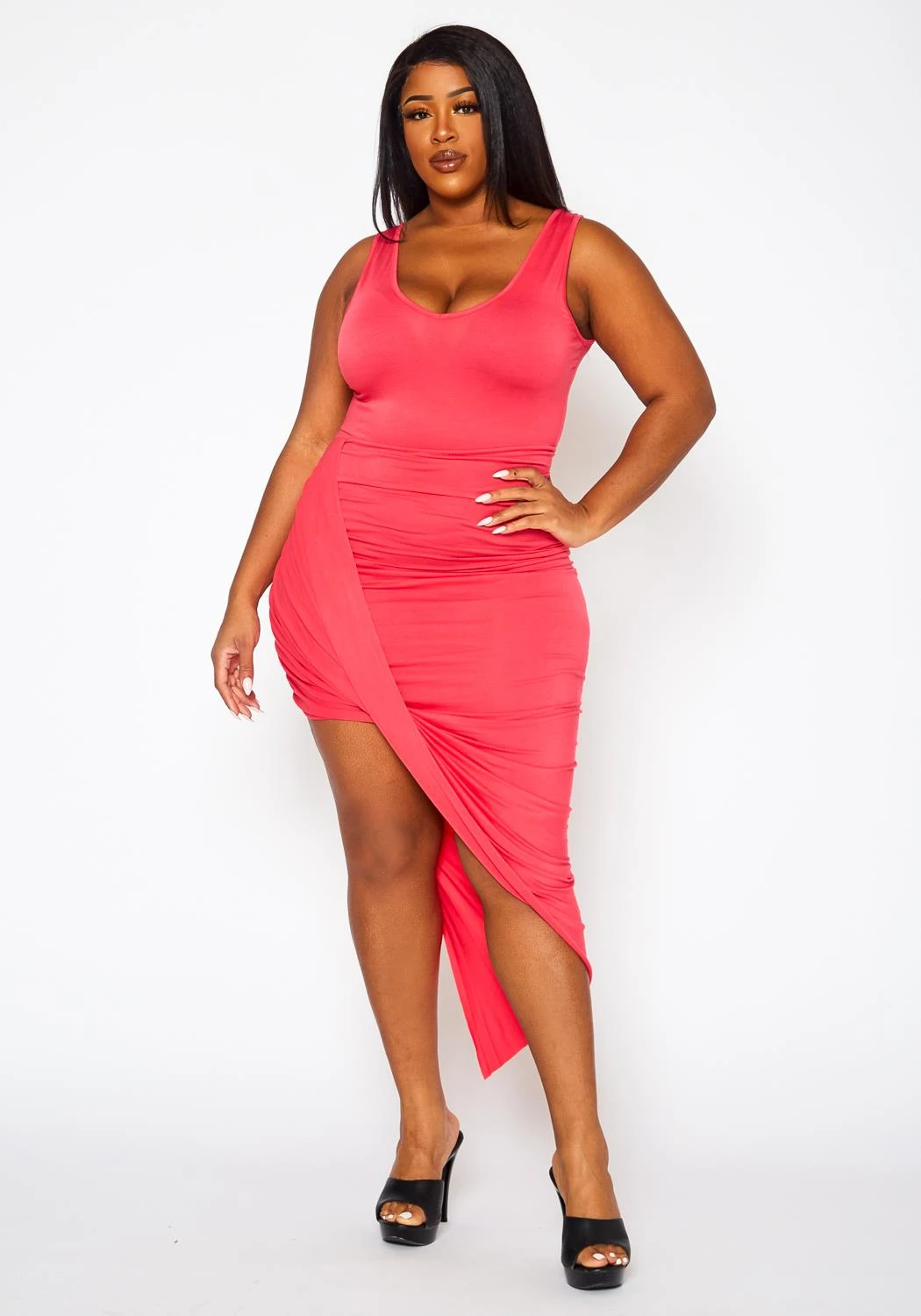 Where to? A beachside brunch or a night club scene? Who cares! You’re turning heads in this gorgeous bodycon dress that flatters your every curve. Features a v-neck line, sleeveless style and ruching with an overlay asymmetric hem that definitely serves the trend.