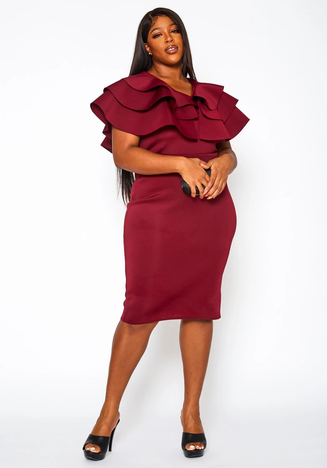 Perfect plus size women’s cocktail dress with ruffle hem design, bodycon fit and thick body hugging material.